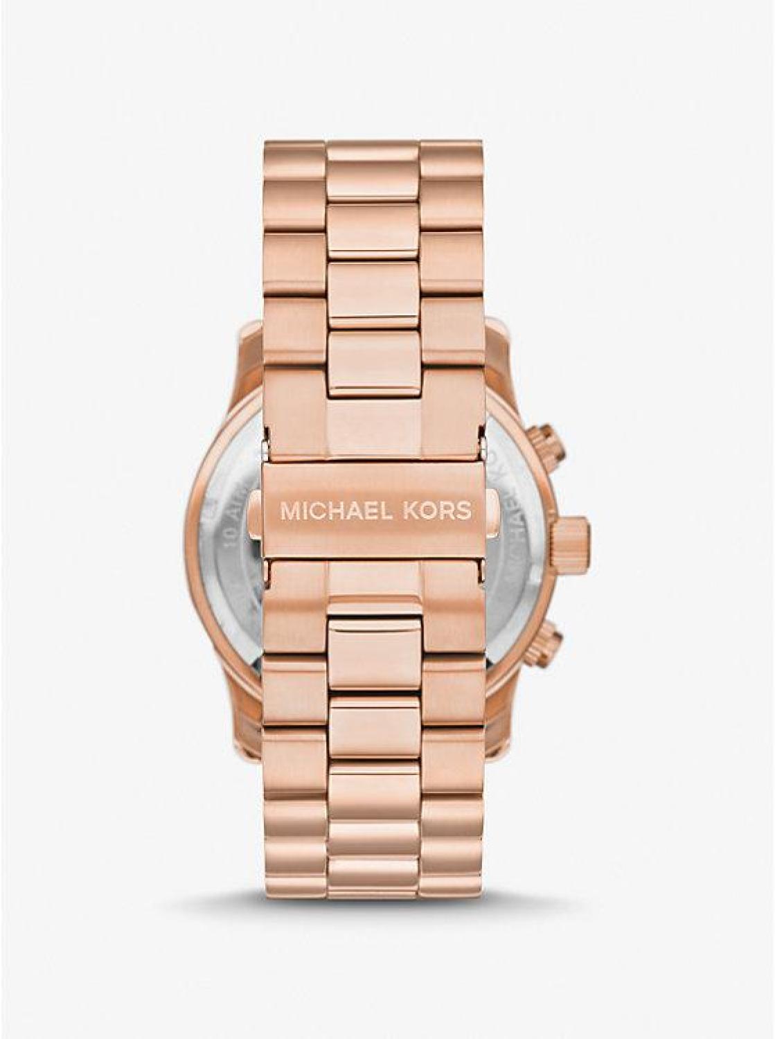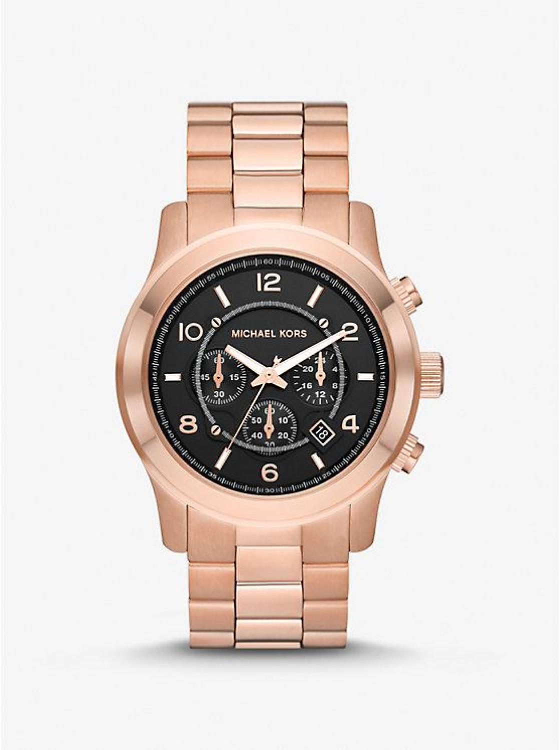 • A perennial favorite, our Runway watch is updated with a sunken black dial for a refined, versatile finish. This ultra-sleek style is crafted from rose gold-tone stainless steel with a polished bracelet strap, and features chronograph details for precise timekeeping.