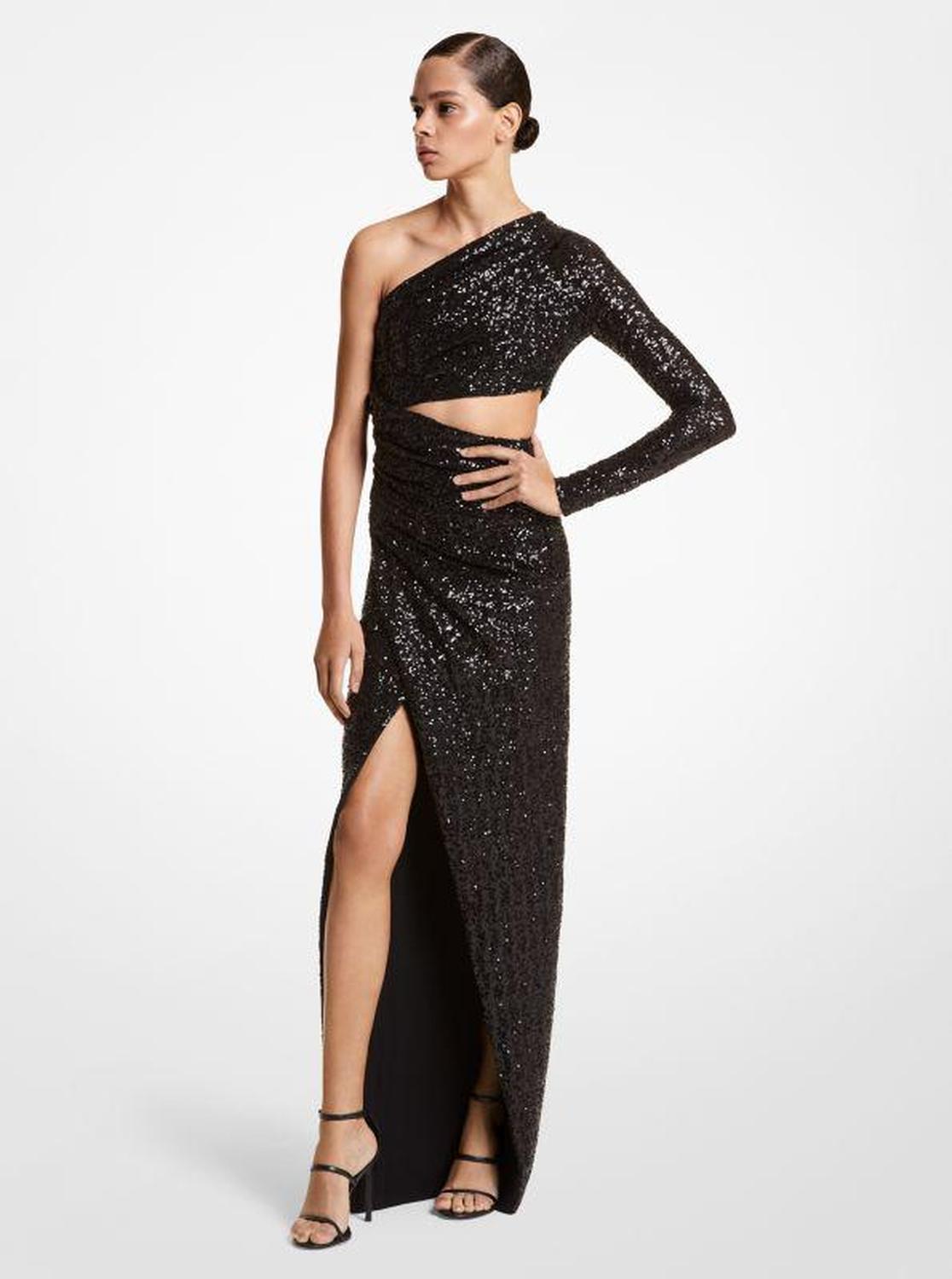 Striking cutouts and intricate paillette embroidery come together on this showstopping gown. Exquisitely tailored in Italy from stretch matte jersey, it features a sultry leg slit for an alluring finish. Wear it with sleek sandals to your next event.