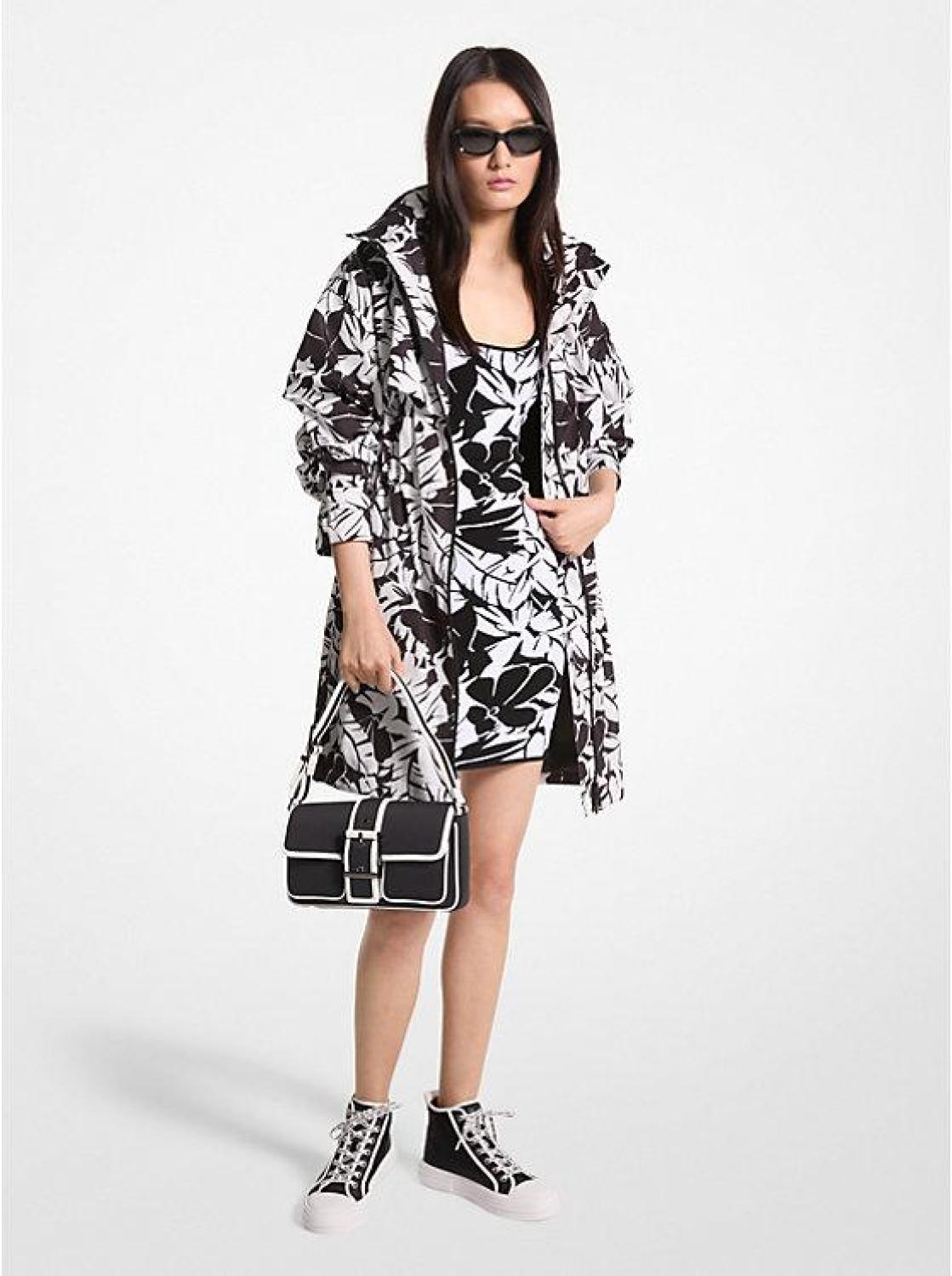 This palm print anorak is a standout jacket to wear come rain or shine. The cotton jersey style is finished with an adjustable hood, as well as drawstring ties at the waist for a customized fit. Complement the motif with black-and-white separates for a bold monochromatic look. • Anorak • Woven • 100% recycled polyester • Zip fastening • Machine wash • Imported • Model is 5'9"/175 cm wearing size XS • Anorak • Woven • 100% recycled polyester • Zip fastening • Machine wash • Imported • Model is 5'9"/175 cm wearing size XS