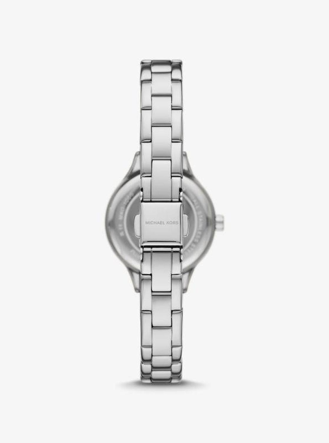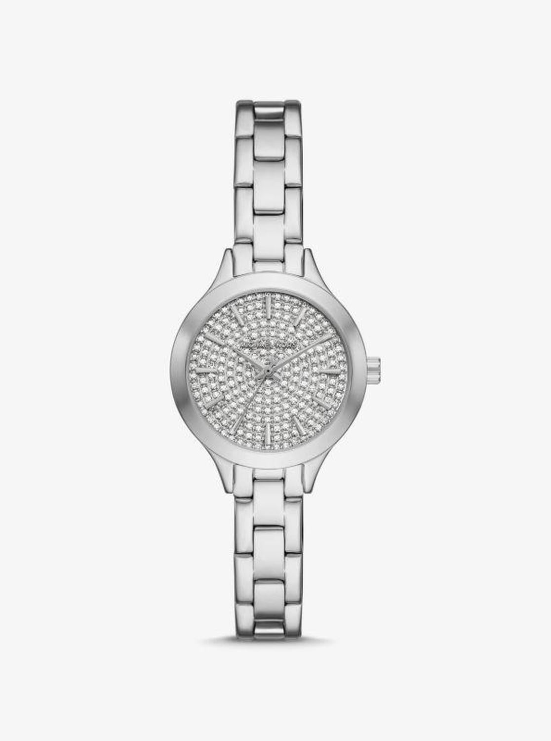 • The petite Aspyn is the perfect timepiece to take your outfits up a notch. A silver-tone stainless steel finish makes for easy styling with jewelry, while the dazzling pavé dial adds a touch of everyday indulgence. This watch is guaranteed to become a talking point wherever you go, so wear it from the office to the dance floor with equal panache.