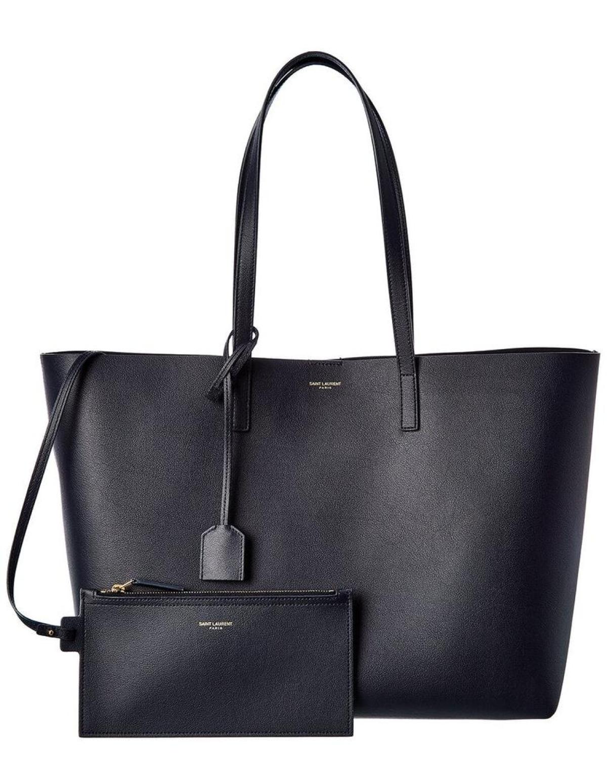 Introducing the Saint Laurent E/W Leather Shopper Tote, a luxurious addition to your handbag collection. This iconic piece from the renowned brand, Saint Laurent, combines modern glam with timeless style, making it a must-have for any fashion-forward woman.Crafted with precision in Italy, this large leather shopping tote showcases impeccable craftsmanship and attention to detail. Adorned with exquisite gold-tone hardware, the navy leather exterior exudes an air of sophistication and refinement.Open the top with magnetic closure to reveal a spacious interior, lined with sumptuous suede. The thoughtful interior design includes a removable zippered pouch, providing convenient storage for your essentials. With measurements of 14 inches wide, 12 inches high, and 5 inches deep, this tote offers ample space to accommodate your belongings.Designed for practicality and comfort, this tote features top handles with a drop length of 10.5 inches, allowing for easy carrying. Whether you're heading to the office or running errands, this bag effortlessly combines style and functionality to meet your daily needs.Please note that all measurements were taken by hand and are approximate. Slight variations may occur, adding a unique touch to each individual piece.Rest assured, as a trusted retailer, we guarantee the authenticity of every product we sell. While we may occasionally source merchandise from trusted independent suppliers, our commitment to providing genuine products remains steadfast.Elevate your ensemble with the Saint Laurent E/W Leather Shopper Tote, a true embodiment of elegance and luxury. Shop now and experience the allure of this exquisite handbag.