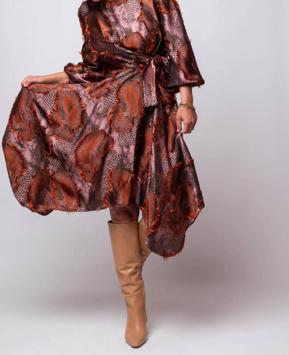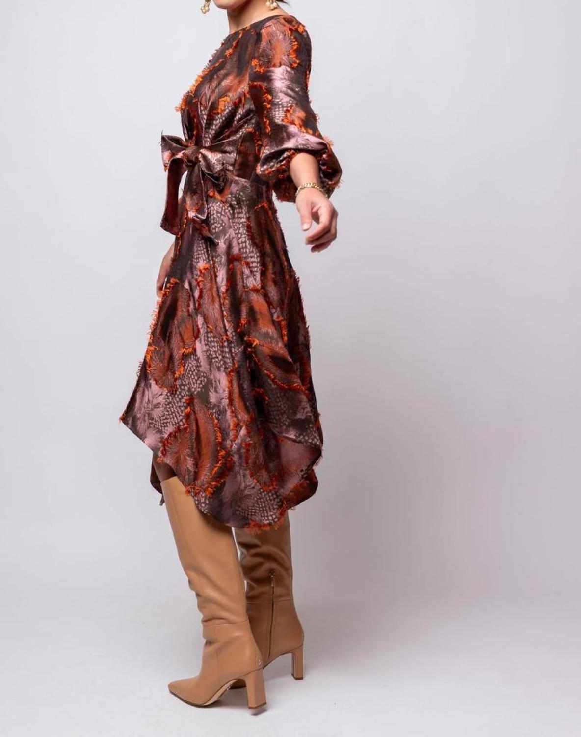 • A midi dress so versatile, your options for wearing it are endless.Its copper-hued plume patter, midi length, uneven hem, 3/4 sleeves, and front ties create a unique, flattering look perfect for any occasion. Dry Clean. 100% Viscose. Made in USA.