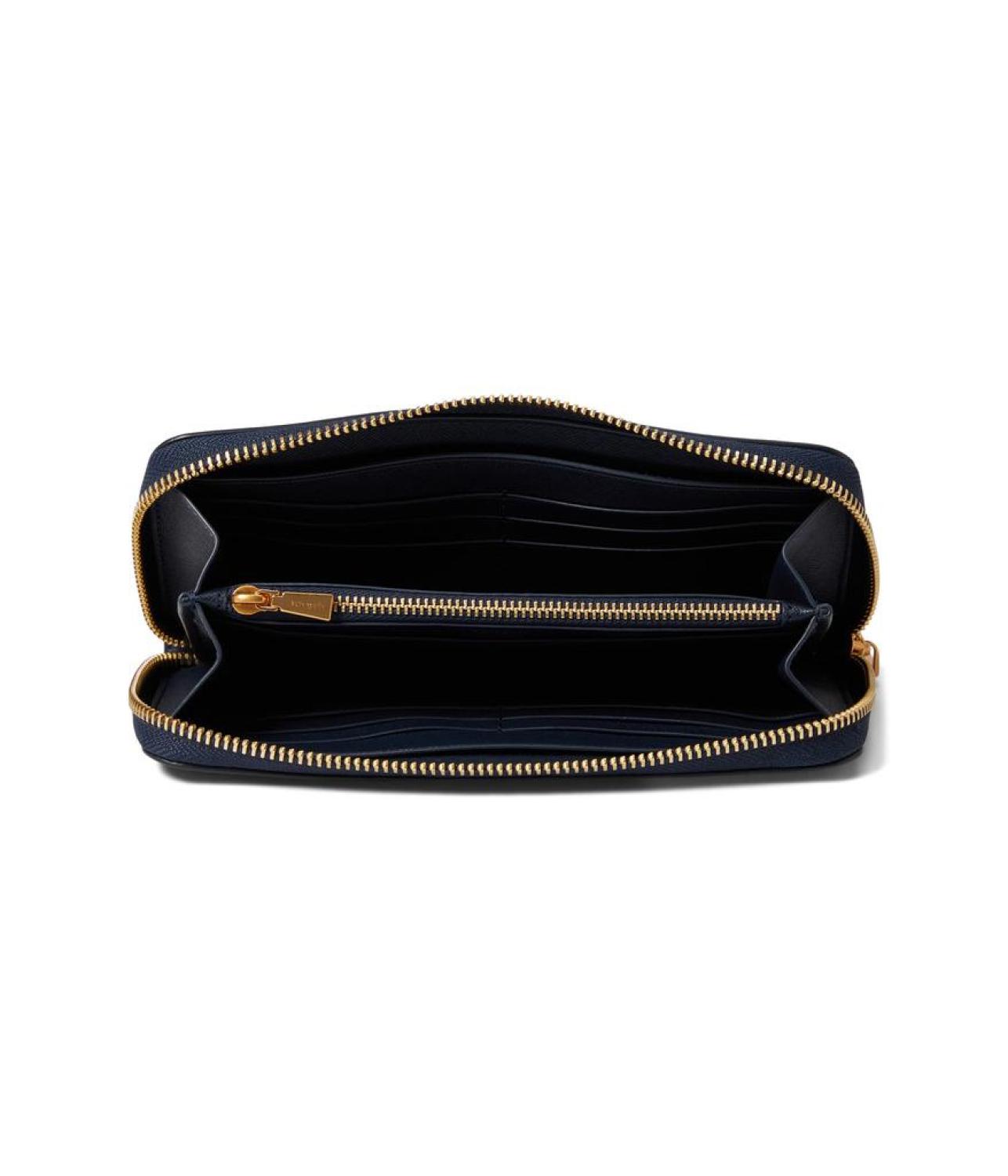 Continental wallet with zip-around closure.