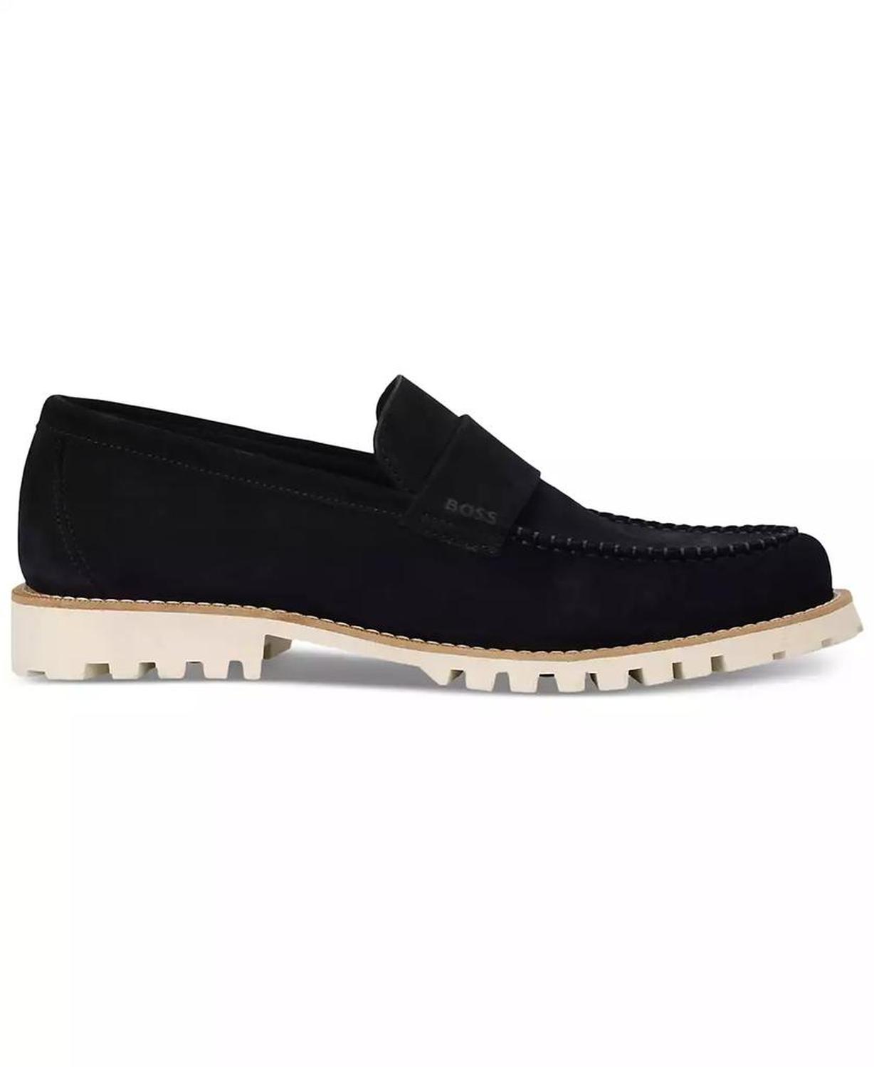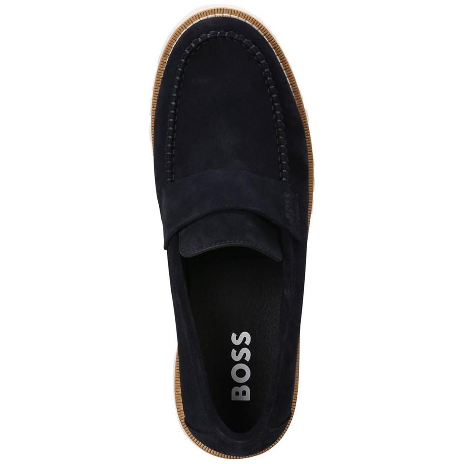 Pairing an elegant upper with a rugged lug sole, these loafers from BOSS by Hugo Boss lend a fresh modern feel to your casual look. Round moc toe Slip on Lug sole Logo detailing vamp strap and footbed Leather upper; polyamide, polyurethane lining; rubber sole Spot clean only Imported