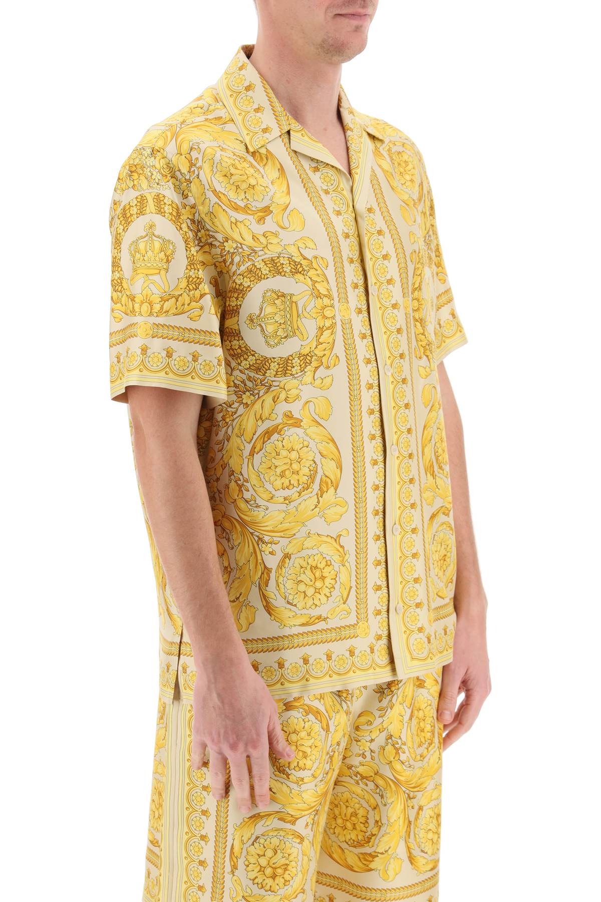 Versace bowling shirt crafted in fluid silk twill with the iconic Barocco pattern printed all over. It features cuban collar, front button placket and side slits on the hem. Loose fit. The model is 187 cm tall and wears size IT 46.