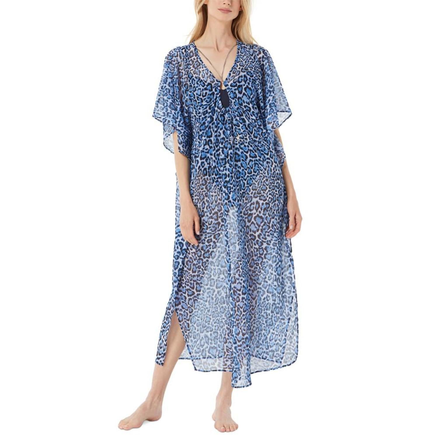 • Animal-print chiffon sizzles with edgy add-ons like the chain neckline trim and ruched keyhole in this flowy caftan midi cover-up from MICHAEL Michael Kors.