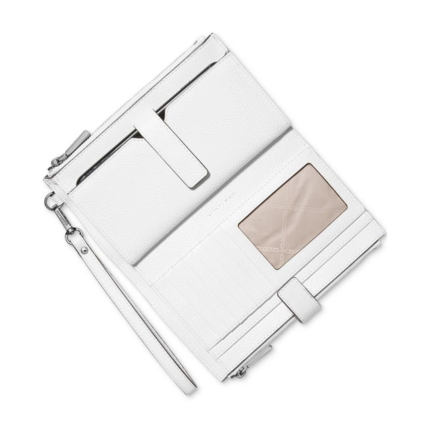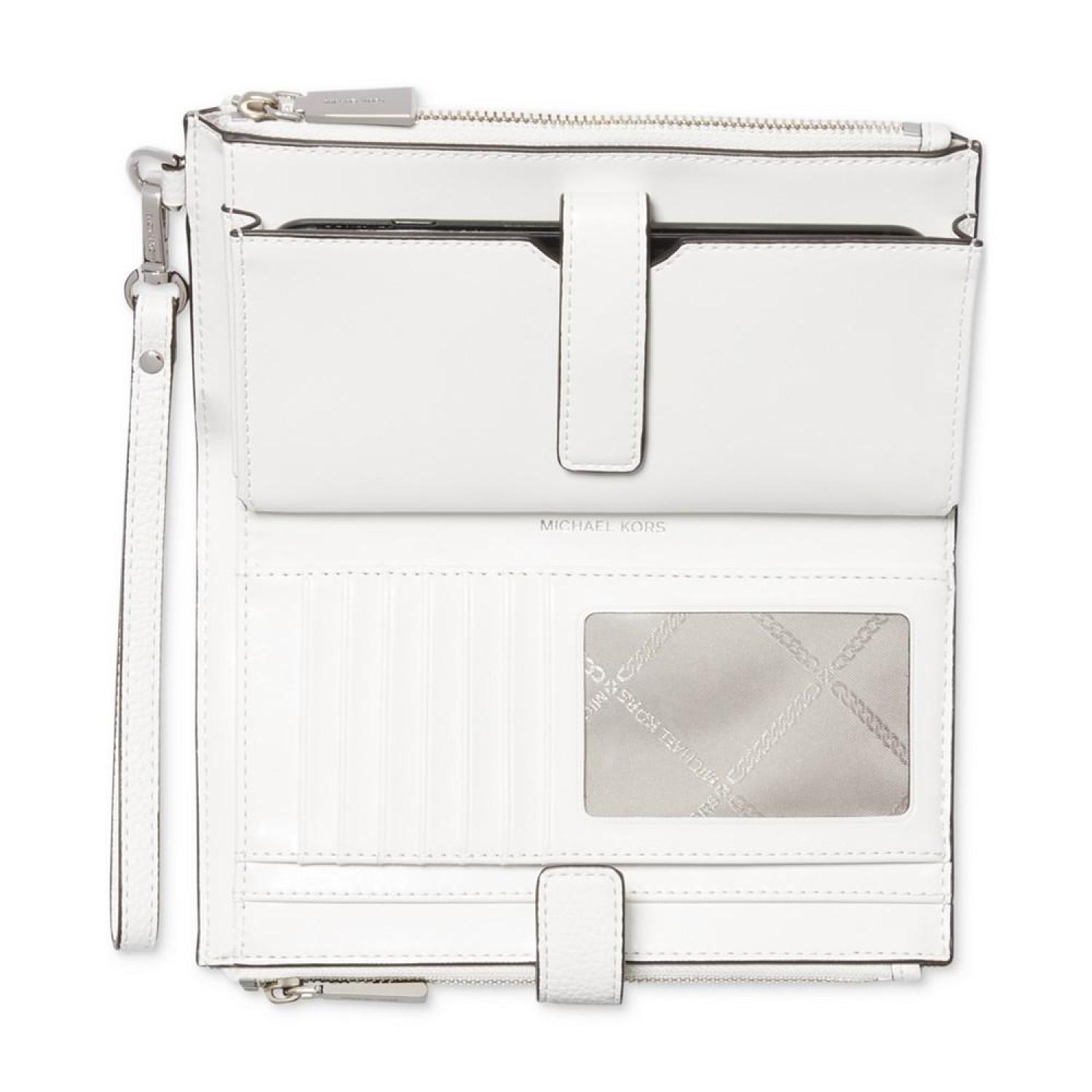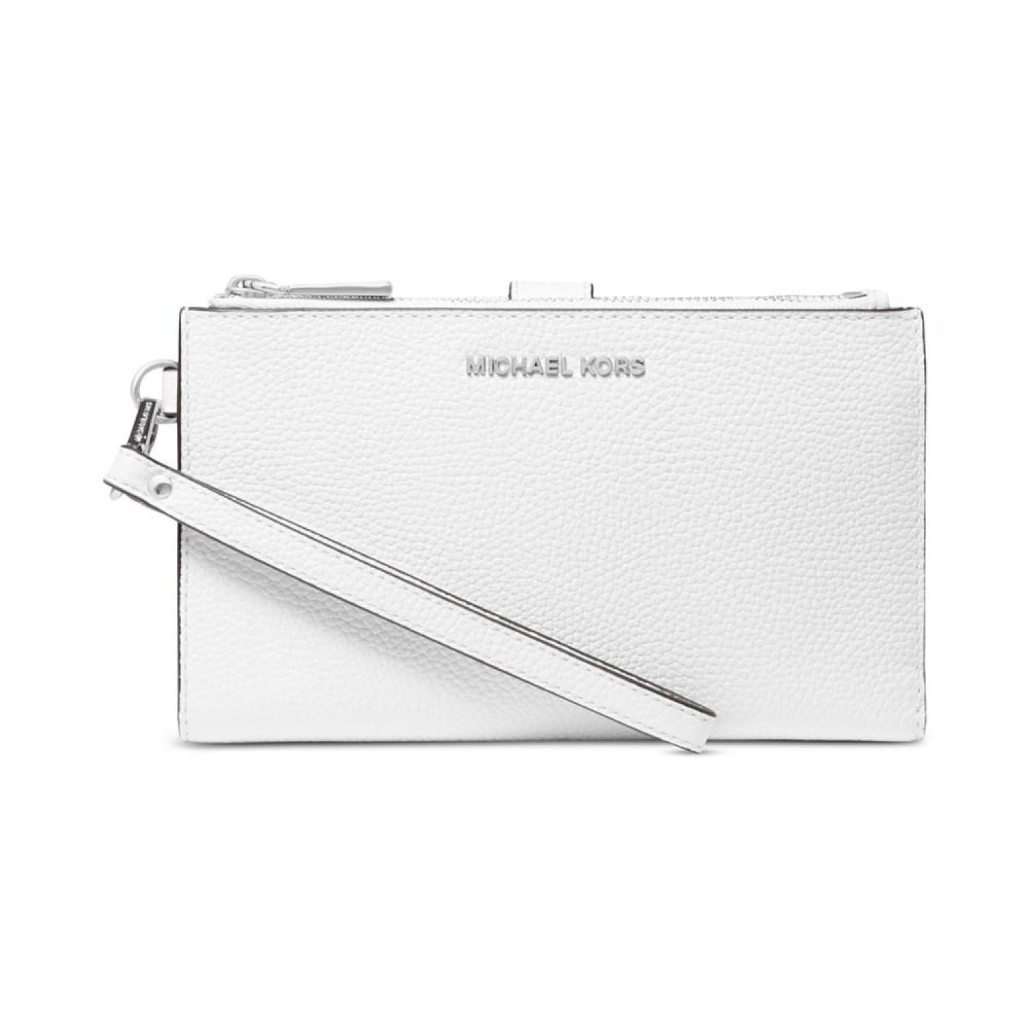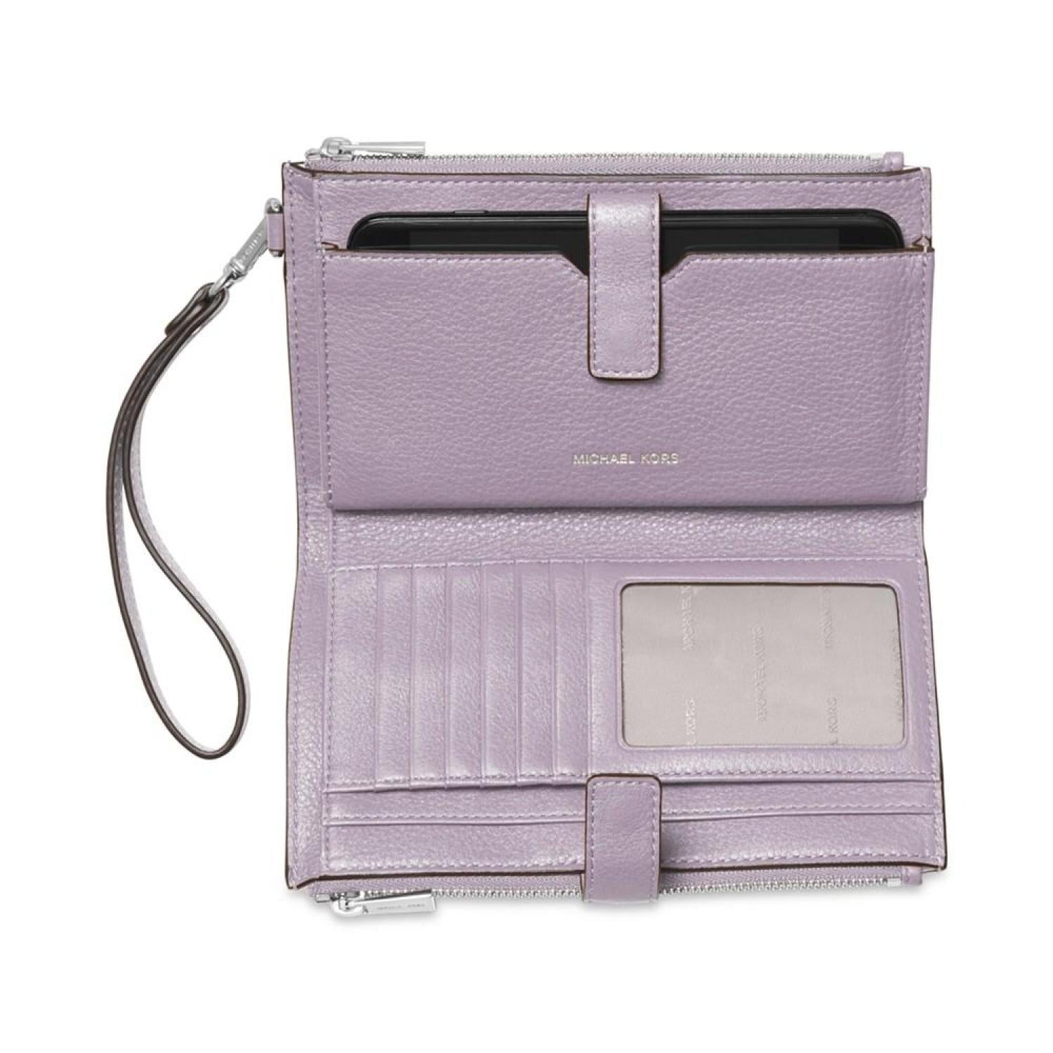 • Plump pebble leather and polished branding lend a refined look to a MICHAEL Michael Kors phone wristlet that fits in hand or a tote.