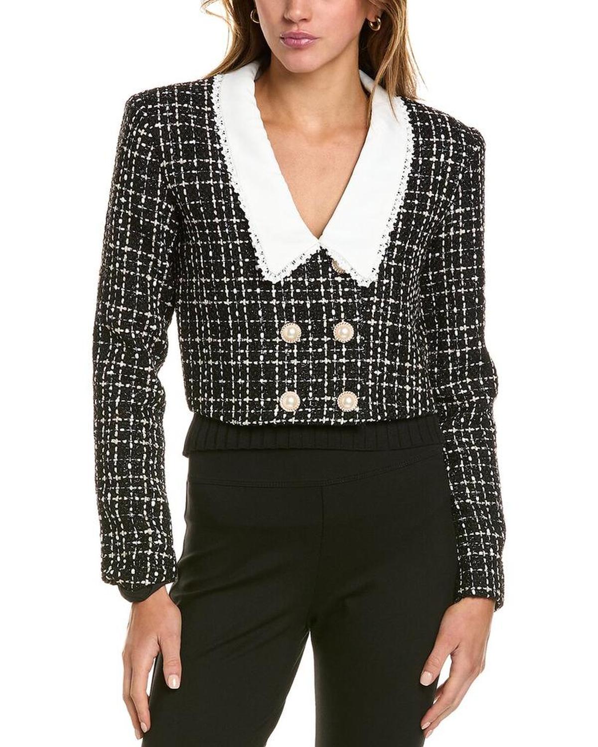 Introducing the Alexia Admor Aurelia Jacket, a stunning addition to your wardrobe from the renowned brand Alexia Admor. This exquisite jacket in black and white features metallic tweed fabric, a spread collar, and lace trim for a touch of elegance. With a double-breasted button front and measuring approximately 16 inches from shoulder to hem, this jacket is perfect for the modern woman who loves beautiful styles. Made of 100% polyester, this jacket is easy to maintain - simply spot clean when needed. Imported for your convenience, the Alexia Admor Aurelia Jacket is a must-have piece for any fashion-forward woman.