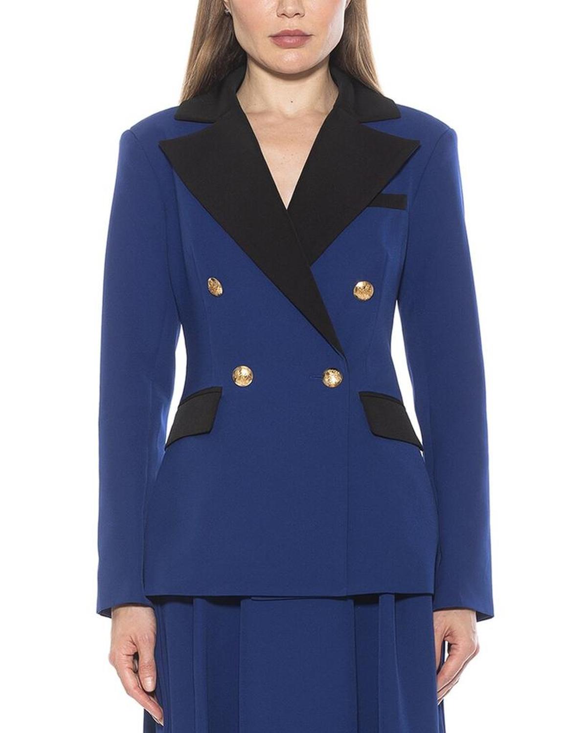 Elevate your professional wardrobe with the Alexia Admor Farrah Blazer in Navy. Featuring a timeless double-breasted design with strong shoulders, this blazer exudes sophistication and style. The button front closure adds a polished touch, while the long sleeves provide a classic silhouette. Made from 97% polyester and 3% spandex, this blazer is both stylish and comfortable. The lining is also made from 97% polyester and 3% spandex for added quality. Hand wash recommended. Imported. About the brand: Alexia Admor offers beautiful styles for the modern woman.