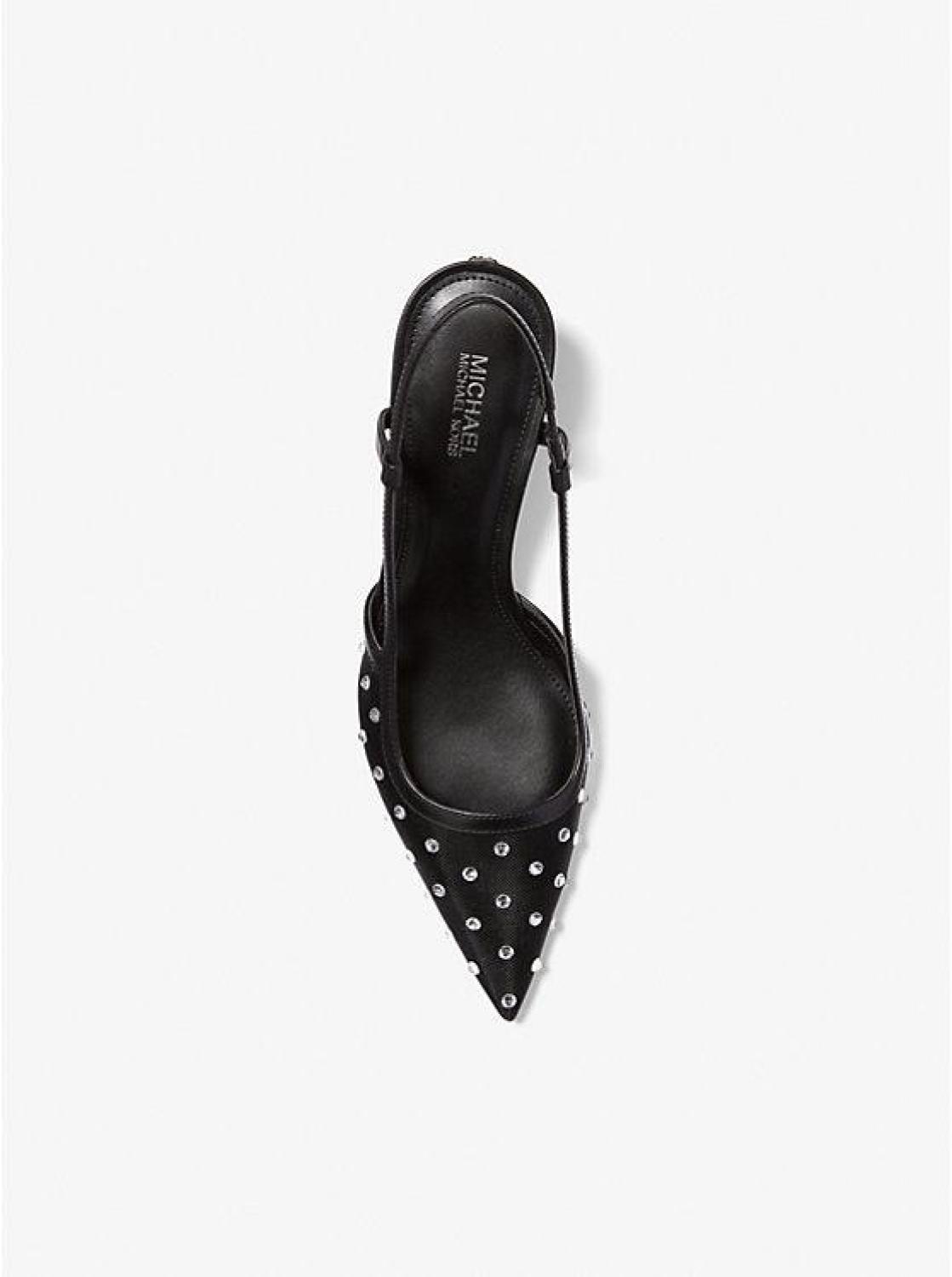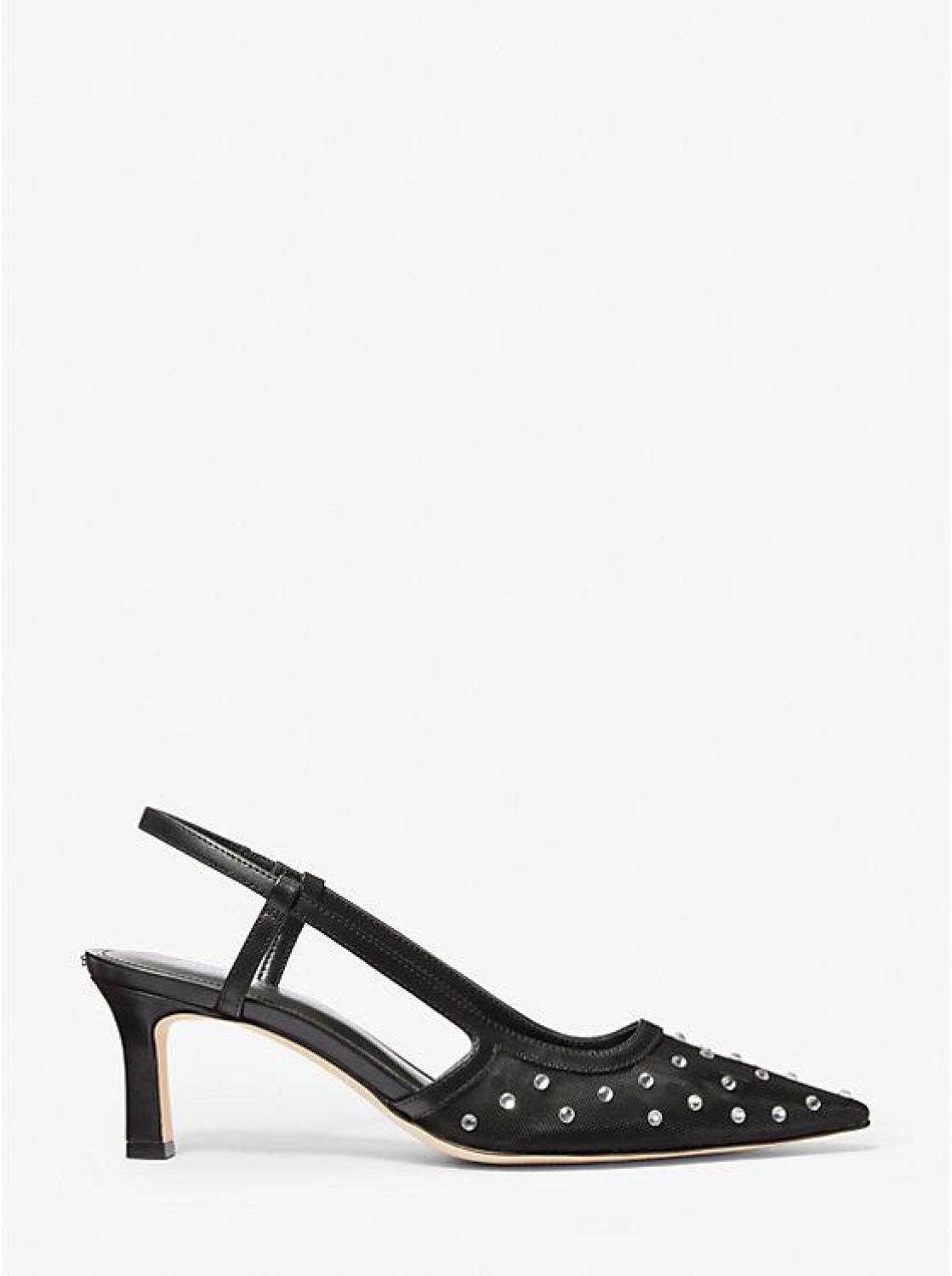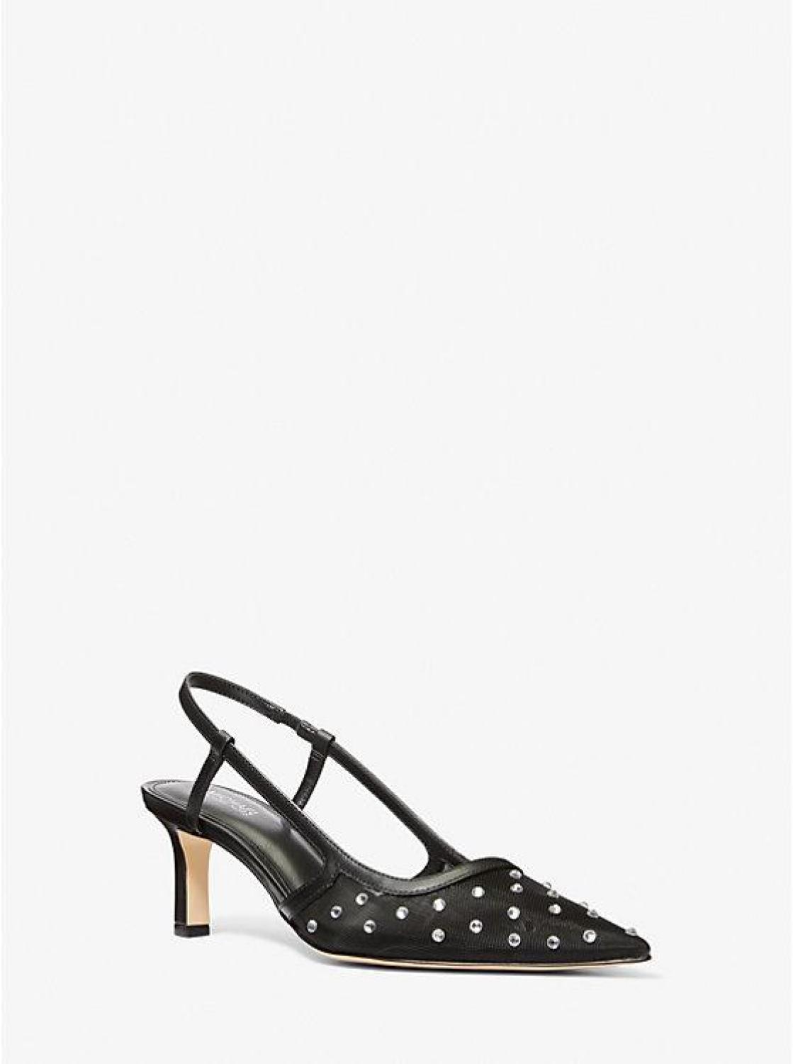 • Cultivate a luxe vibe in the Alora slingback. A crystal-embellished mesh vamp brings a bolt of style to wedding RSVPs, cocktail events and more. This mid-heel silhouette features a pointed toe and a thin leather strap for added support. Pair them with silver accessories to complete the look.