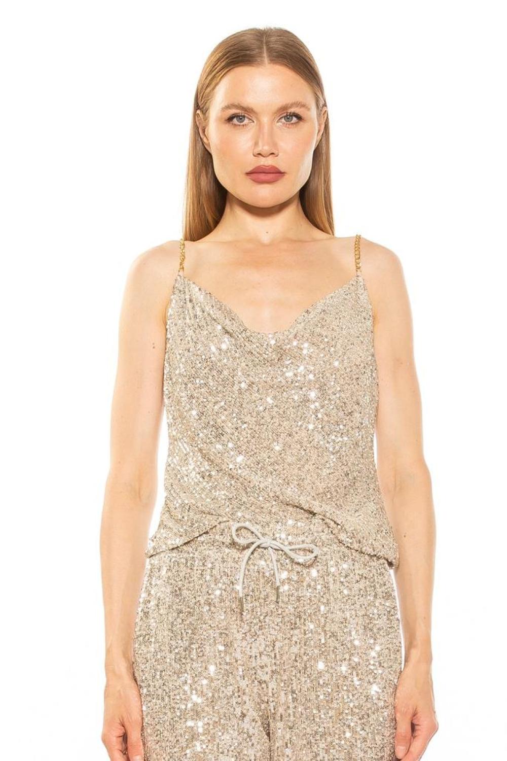 • Be the star of the show in the Aurora Tank! Embellished with shimmering sequins and featuring an eye-catching low-back and chain spaghetti straps. Chain Spaghetti Straps Low Back Draped Cowl Neckline Sequin Tank Top 90% Polyester, 10% Spandex Lining - 100% Polyester Hand Wash Imported Style T621