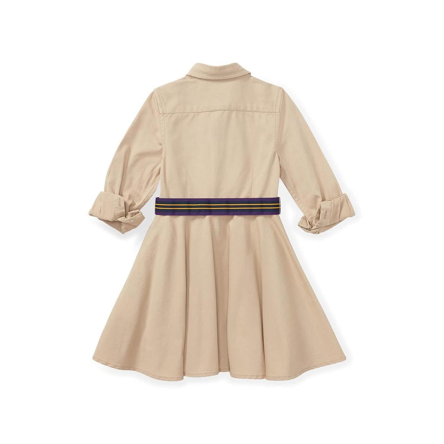 • Have her dressed up in a classic casual look with the  Polo Ralph Lauren® Kids Belted Cotton Chino Shirtdress. This cotton polo shirt dress is crafted with a button-down collar neckline, full button placket, long sleeves with adjustable buttoned barrel cuffs, back yoke, multicolored signature embroidered pony at the front left chest, removable waist belt, ruffled bottom and finished in a khaki wash for a timeless design.