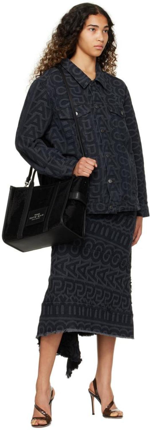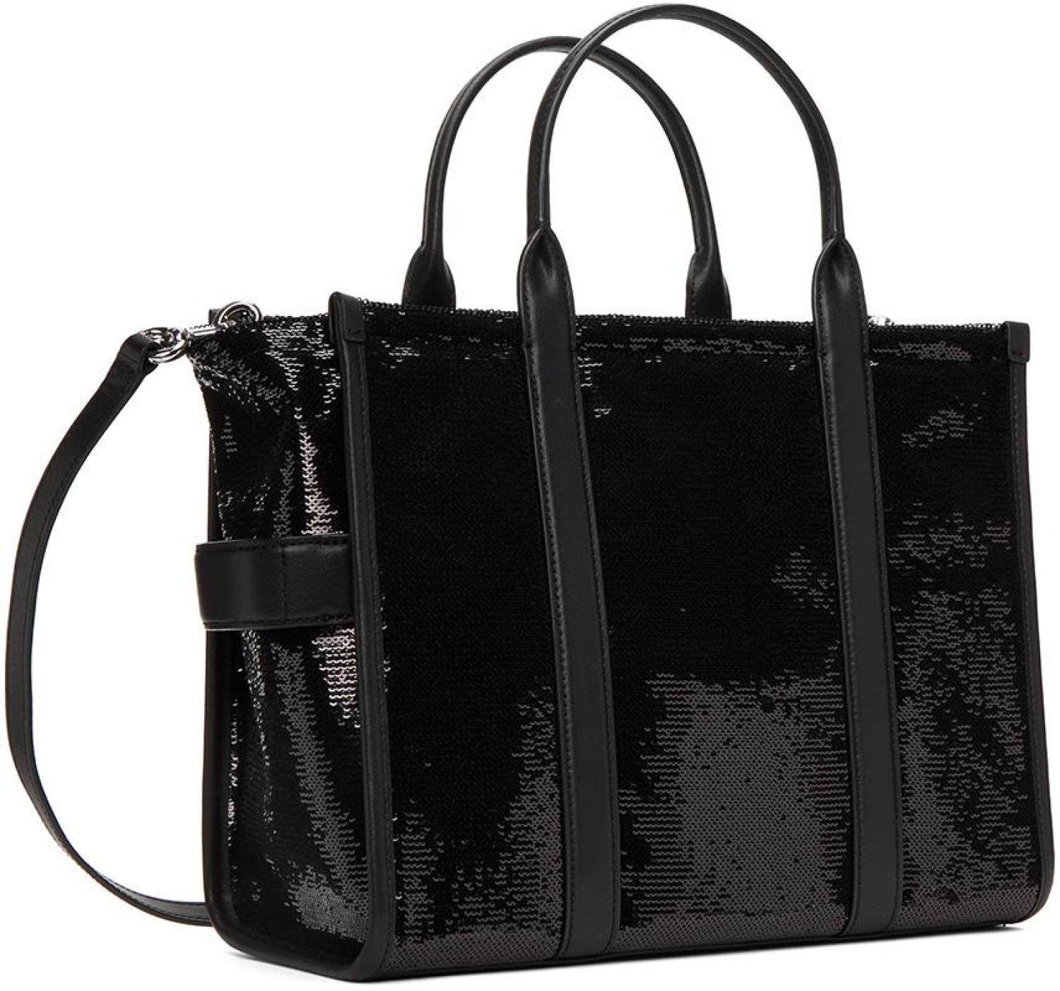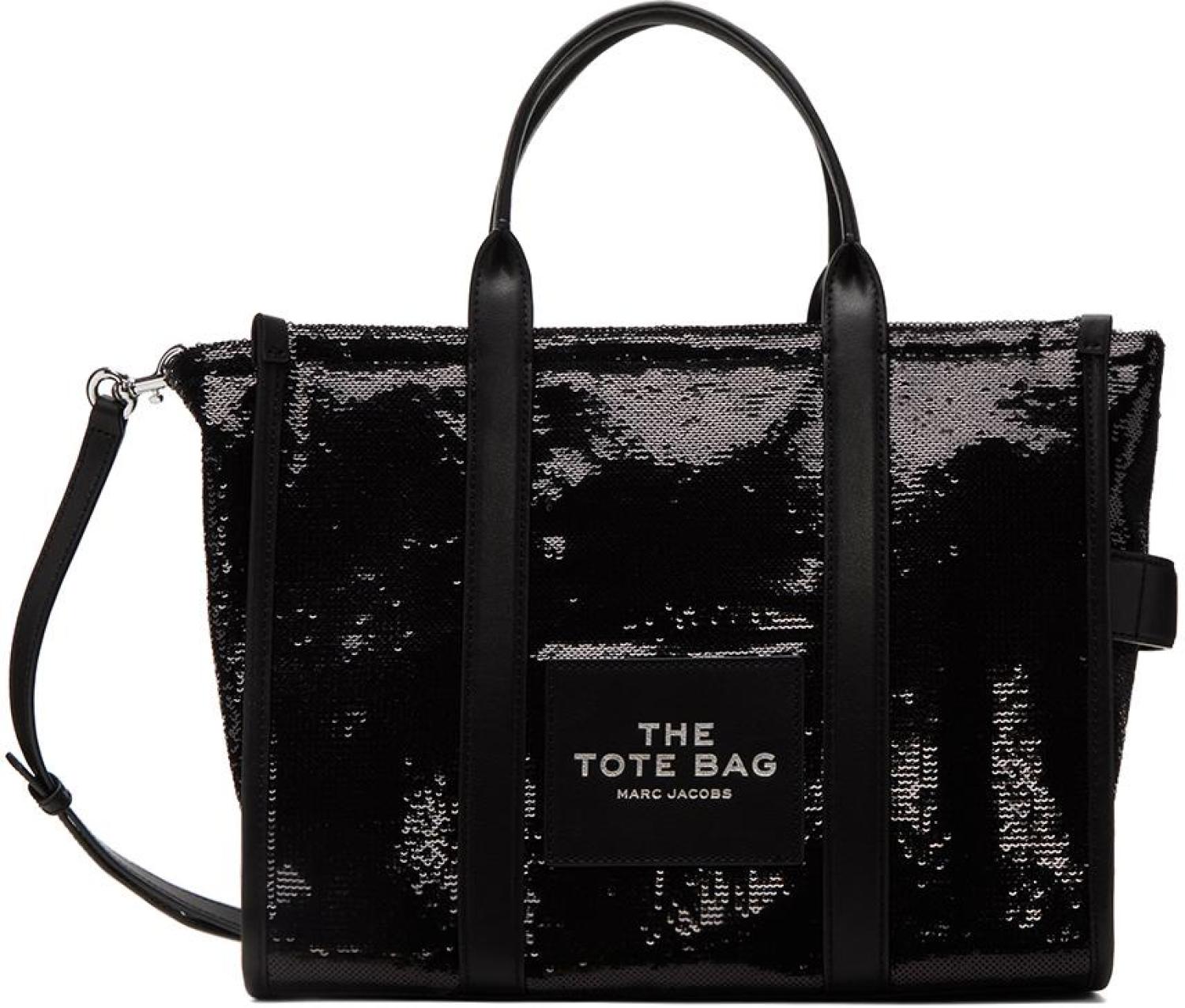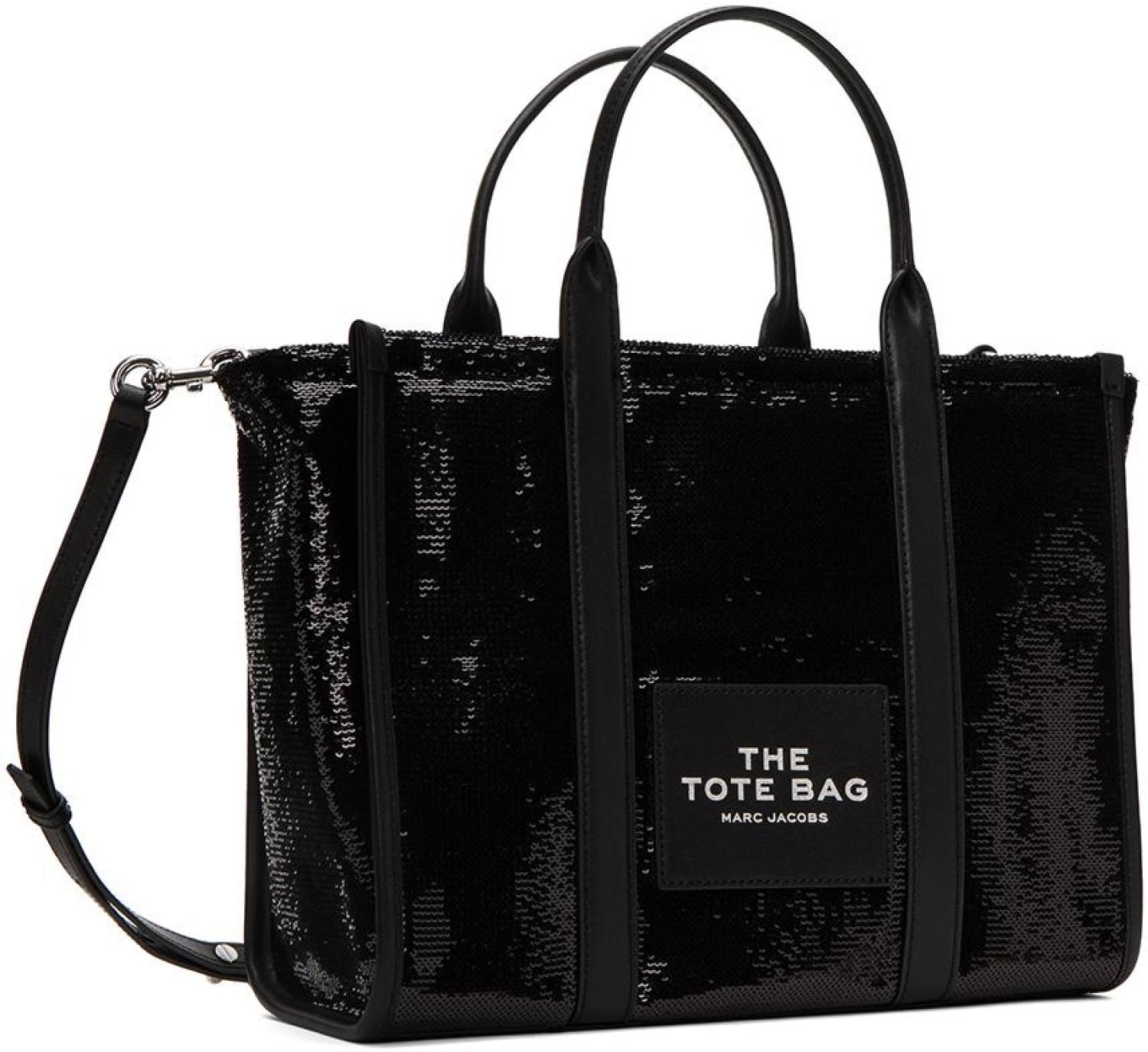 Marc Jacobs Black Medium 'The Tote Bag' Tote Sequinned tote in black. Buffed leather trim throughout. · Twin rolled carry handles at top · Detachable and adjustable shoulder strap · Embossed logo patch at face · Carry handle at side · Zip closure · Zip pocket and two patch pockets at interior · Full canvas lining · H10 x W13 x D5 in Supplier color: Black Leather, textile, synthetic. Made in Viet Nam. 231190F049080