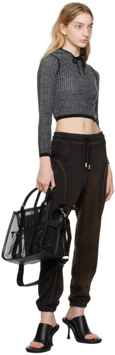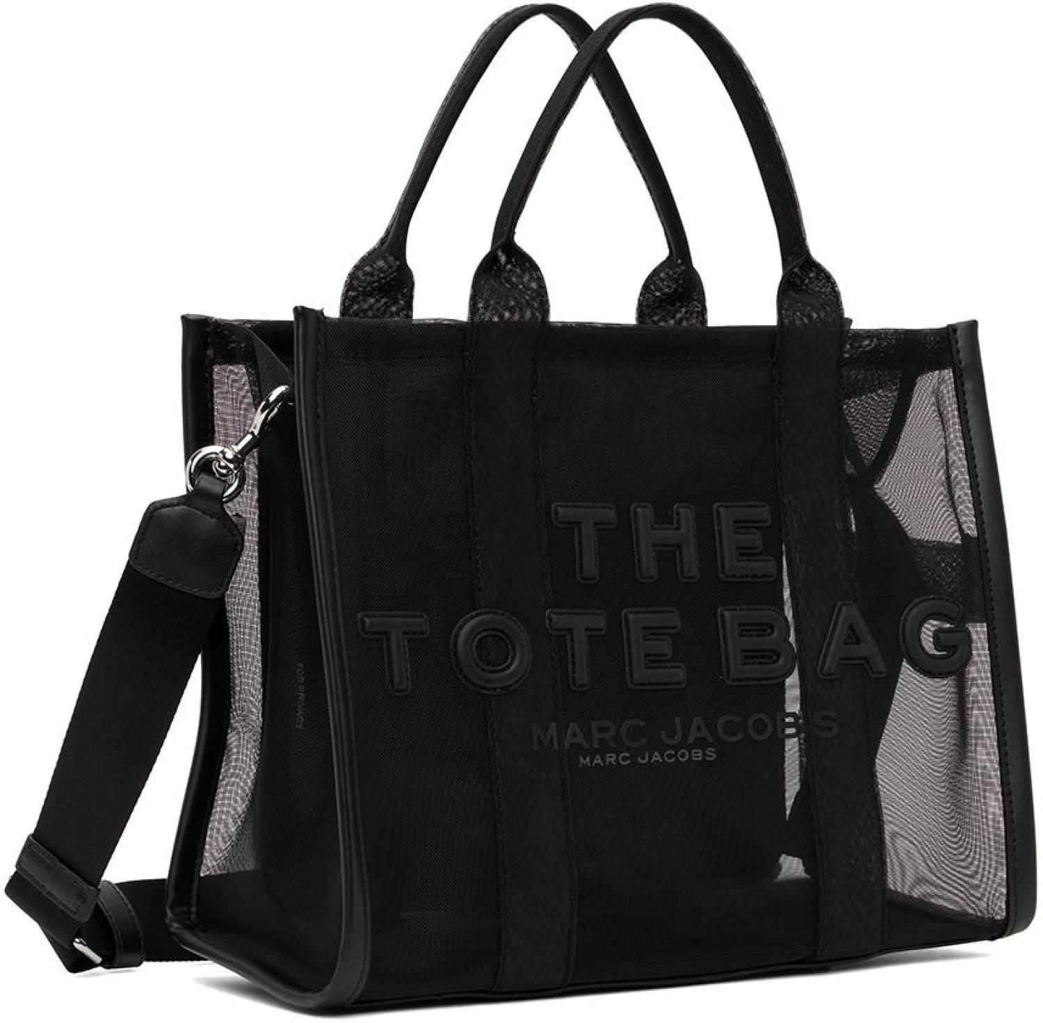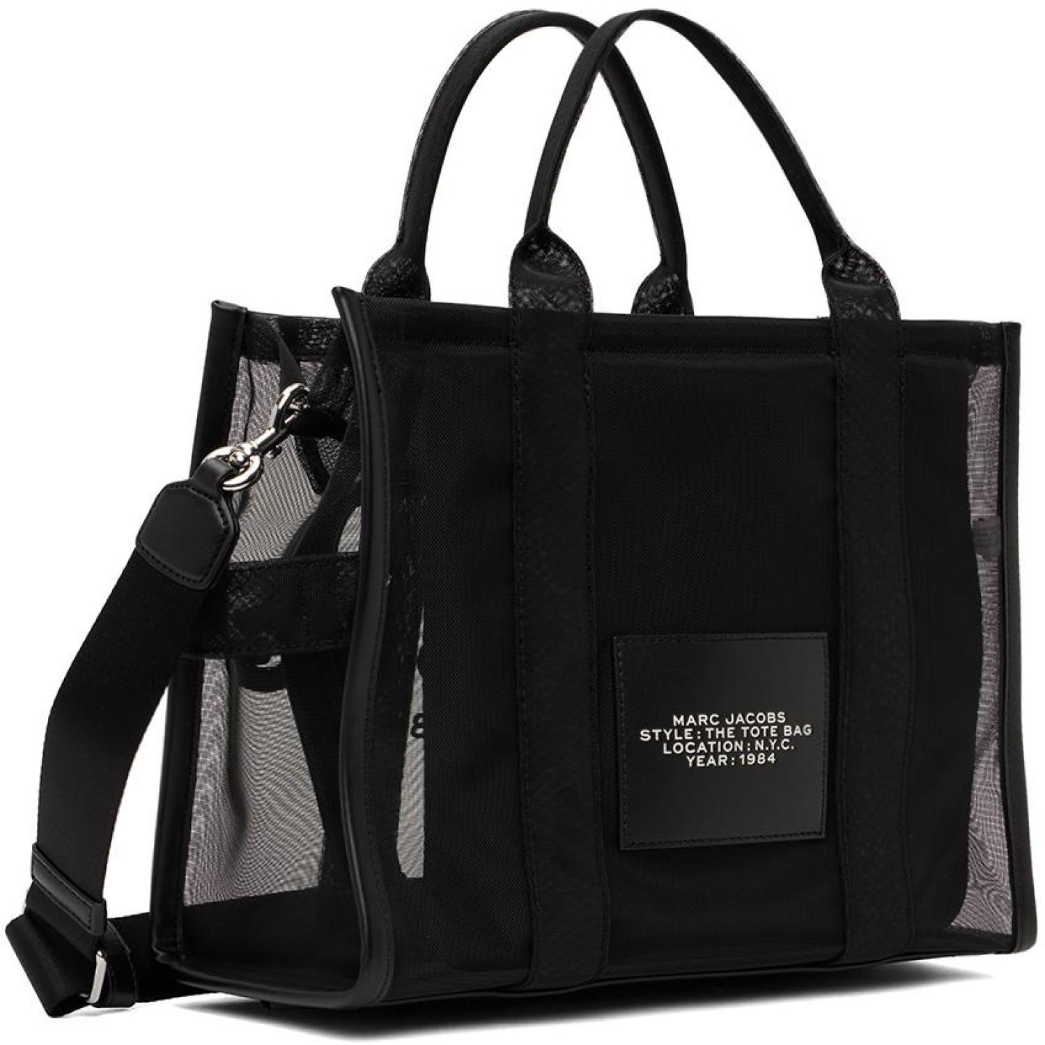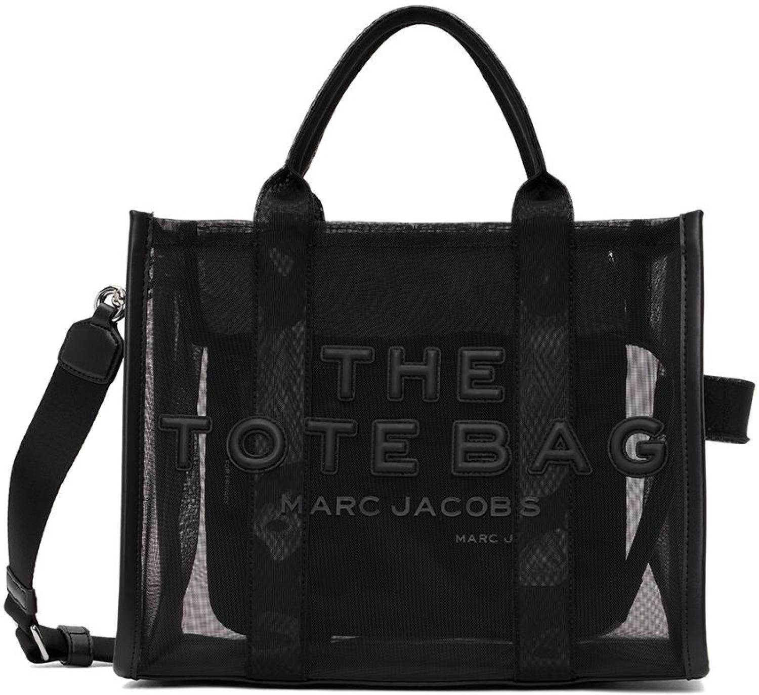 Marc Jacobs Black Medium 'The Tote Bag' Tote Sheer mesh tote in black. Rubberized logo appliqués at face. · Twin rolled carry handles · Detachable and adjustable webbing shoulder strap · Carry handle at side · Logo patch at back face · Zip closure · Patch pockets and zip pocket at interior · Unlined · Logo-engraved silver-tone hardware · H10 x W13 x D6 in Supplier color: Blackout Textile. Made in Viet Nam. 231190F049112