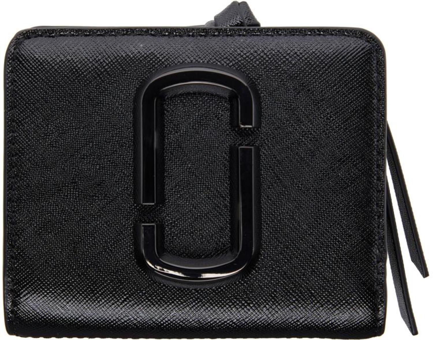 Marc Jacobs Black Mini 'The Snapshot' DTM Compact Wallet Saffiano leather bifold wallet in black. · Logo hardware at face · Press-stud closure · Seven card slots, single note slot, embossed logo, and zippered pocket at interior · Tonal textile lining · Tonal hardware · H4 x W3.25 x D1 in Supplier color: Black Leather. Made in Viet Nam. 221190F040005