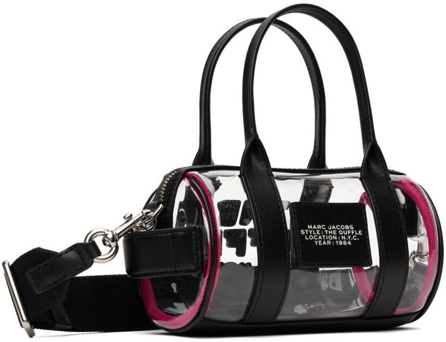 Marc Jacobs Black 'The Clear Mini' Duffle Bag Transparent PVC tote. · Buffed leather trim in black throughout · Twin rolled carry handles · Logo and text embossed at face · Logo patch at back face · Zip closure · Unlined · H5.5" x W7.5" x 4.5" Supplier color: Black Polyvinyl chloride, leather. Made in Philippines. 242190F046011