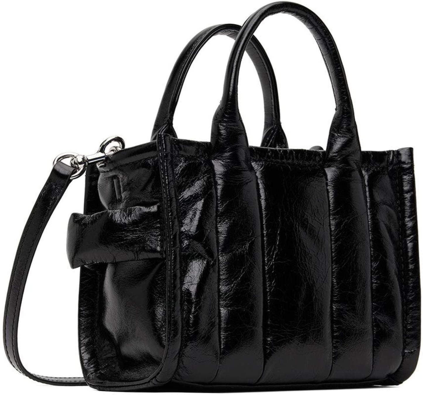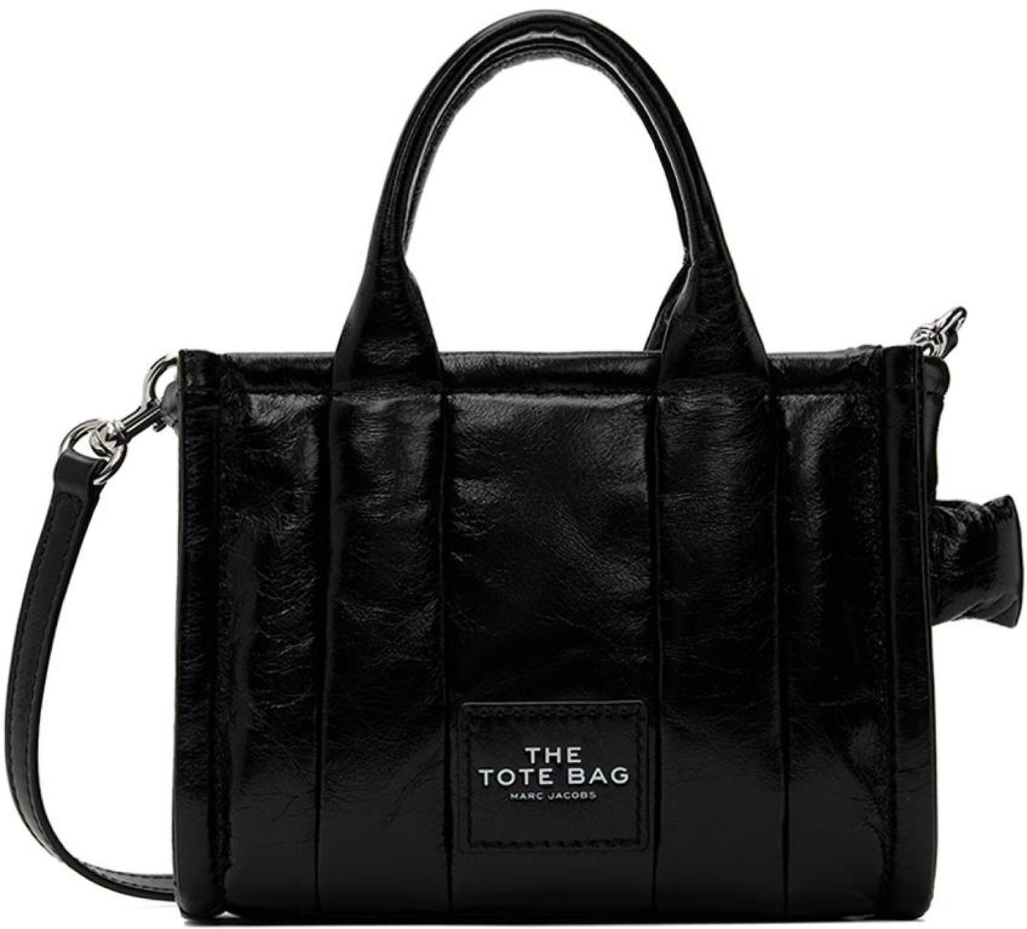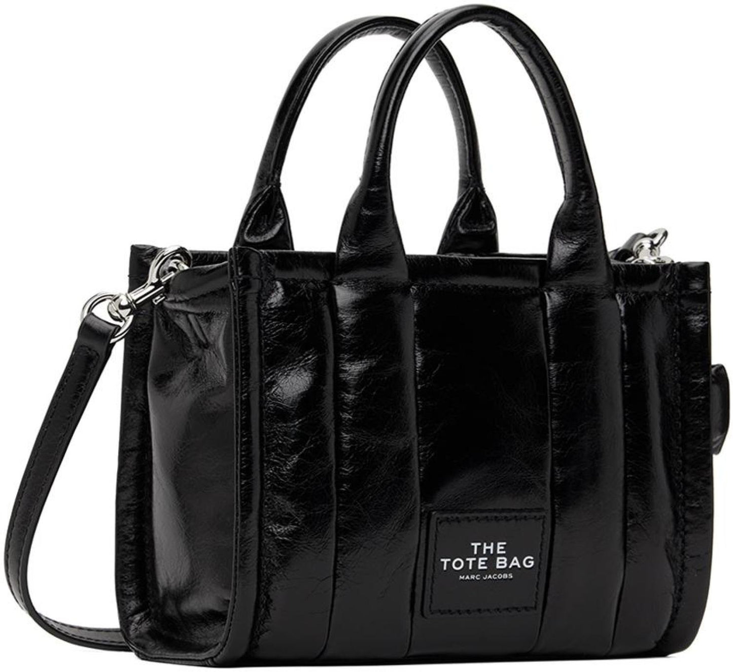 Crinkled patent lambskin tote in black. Logo-embossed leather patch at face.