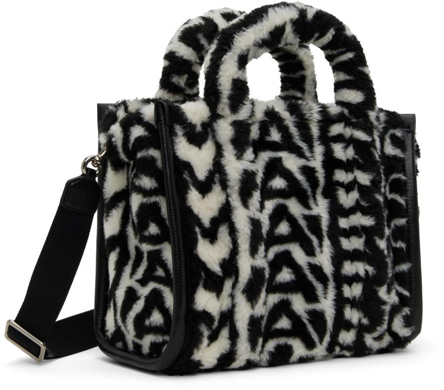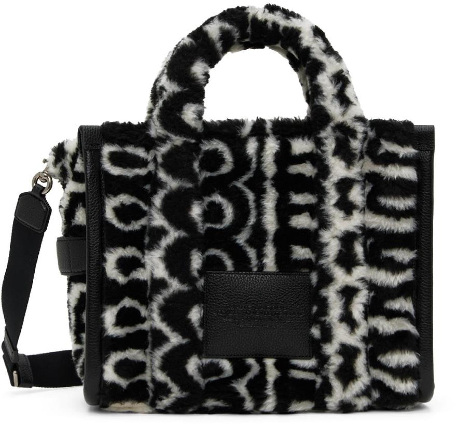 Faux-fur tote in black and white. Grained leather trim and logo pattern throughout.