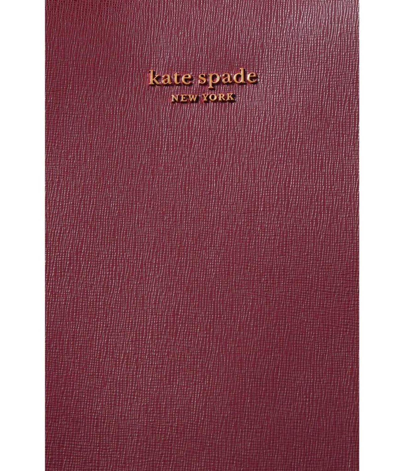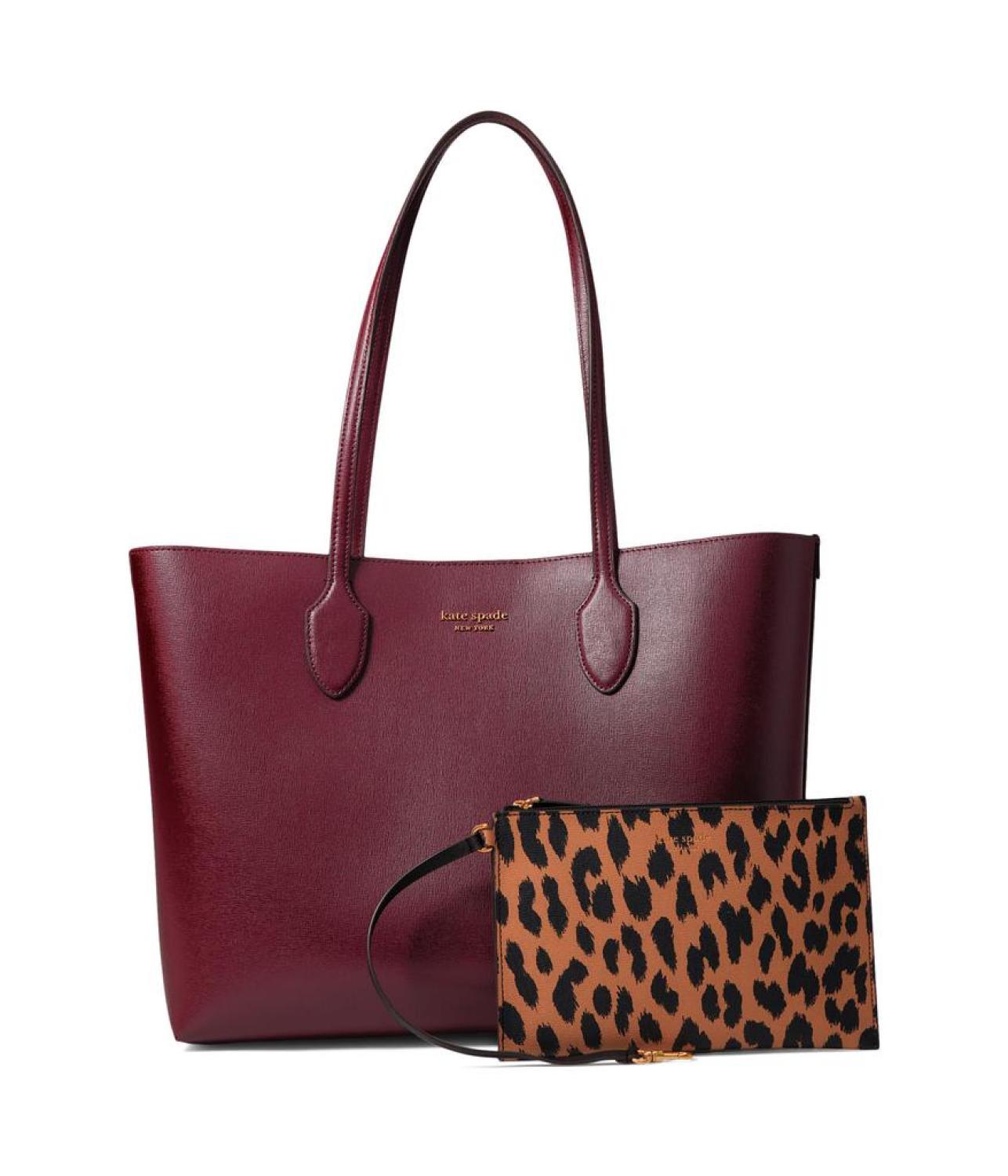 • Put a vintage twist to your boho look carrying the  Kate Spade New York® Bleecker Modern Leopard Interior Pop Printed Large Tote. It is designed with magnetic snap closure, two top handles, and one main compartment.