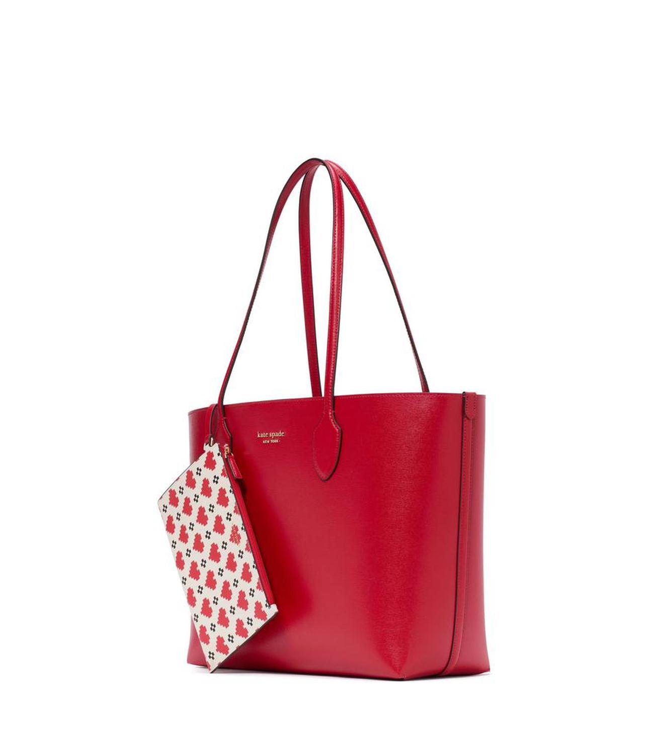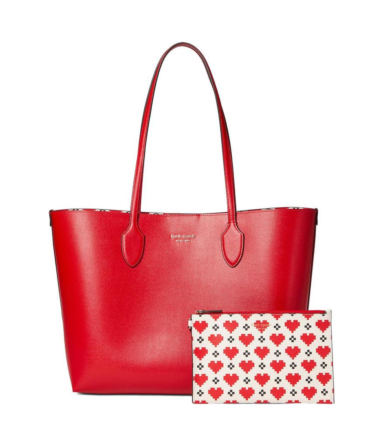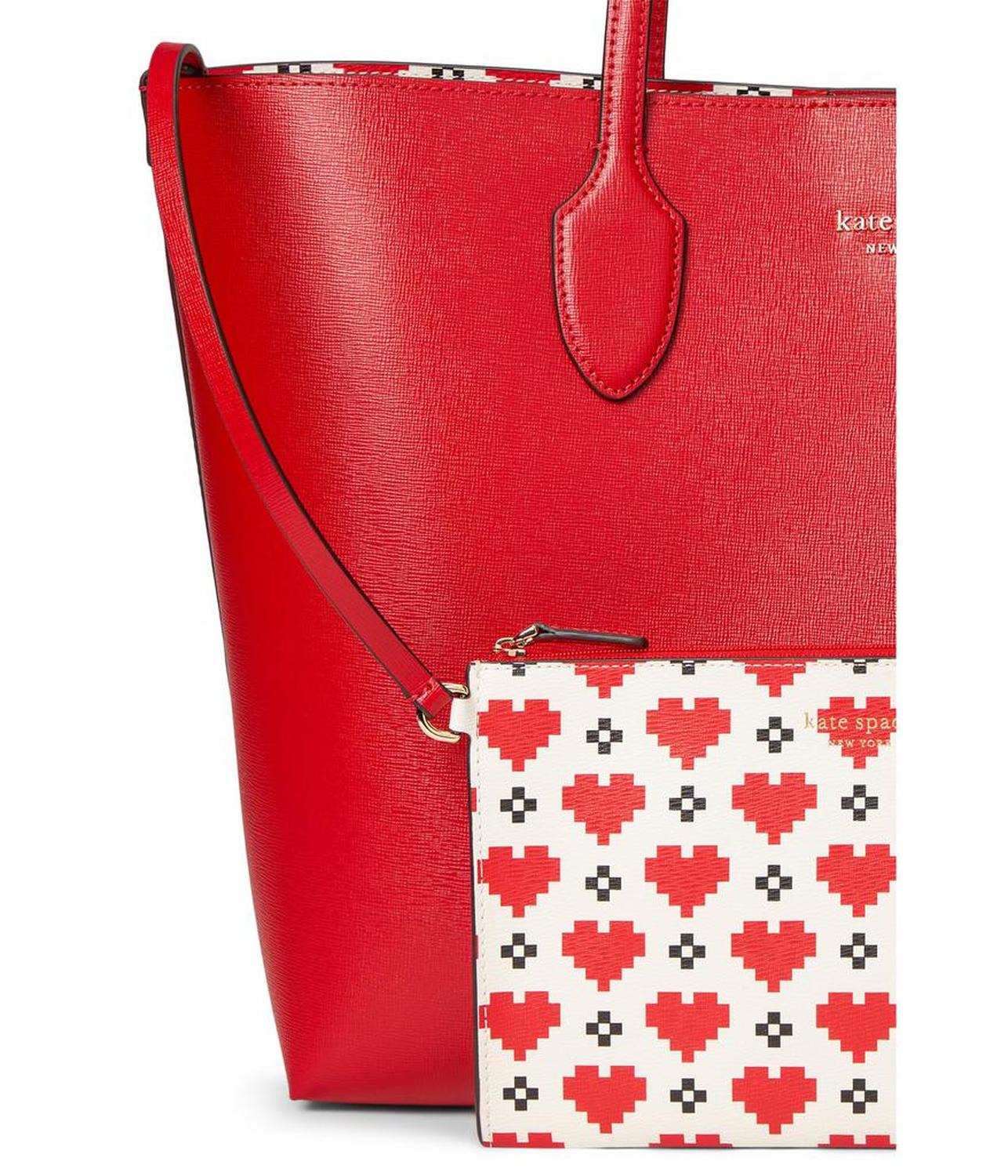 • The Kate Spade New York® Bleecker Pixelated Hearts Pop Print Crossgrain Leather Large Tote is a stylish and versatile accessory for any fashion-forward individual. Made from high-quality cow leather, this tote features a unique hearts pop print that adds a fun touch to any outfit. The magnetic snap closure ensures your belongings stay secure, while the dual shoulder straps make it easy to carry. Plus, it comes with a detachable wristlet pouch with a zippered closure for added convenience.