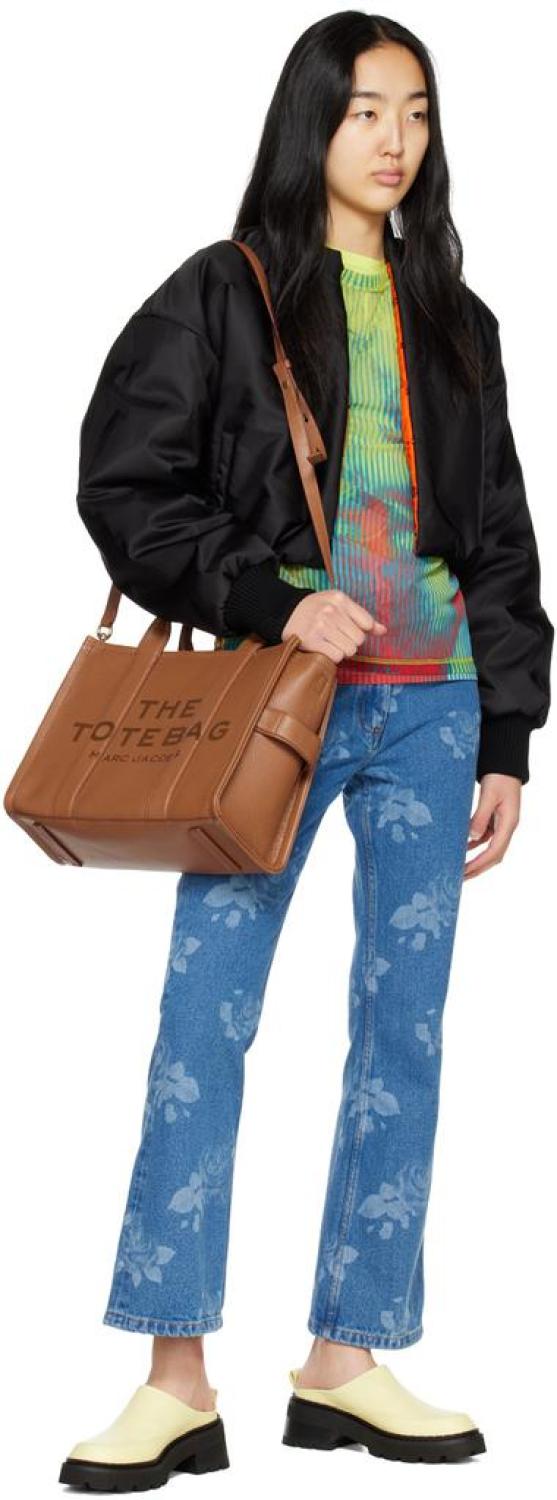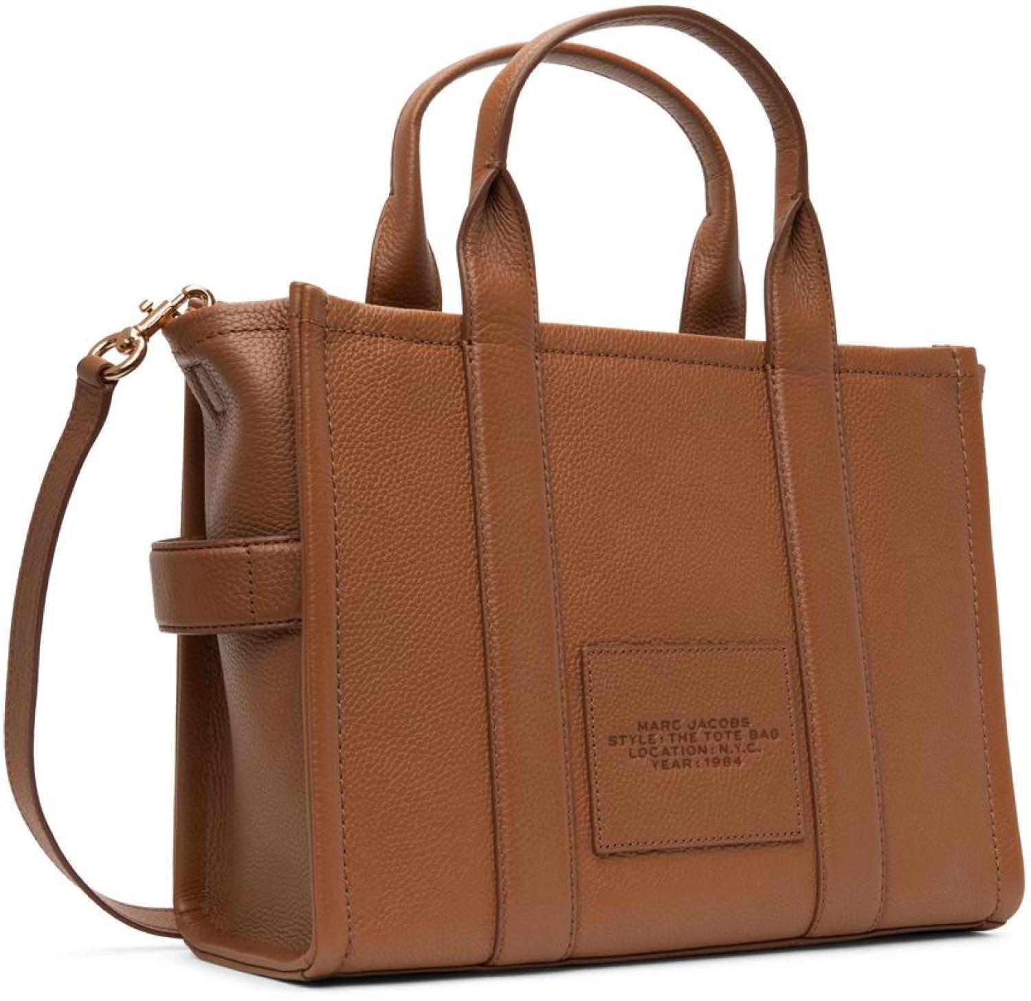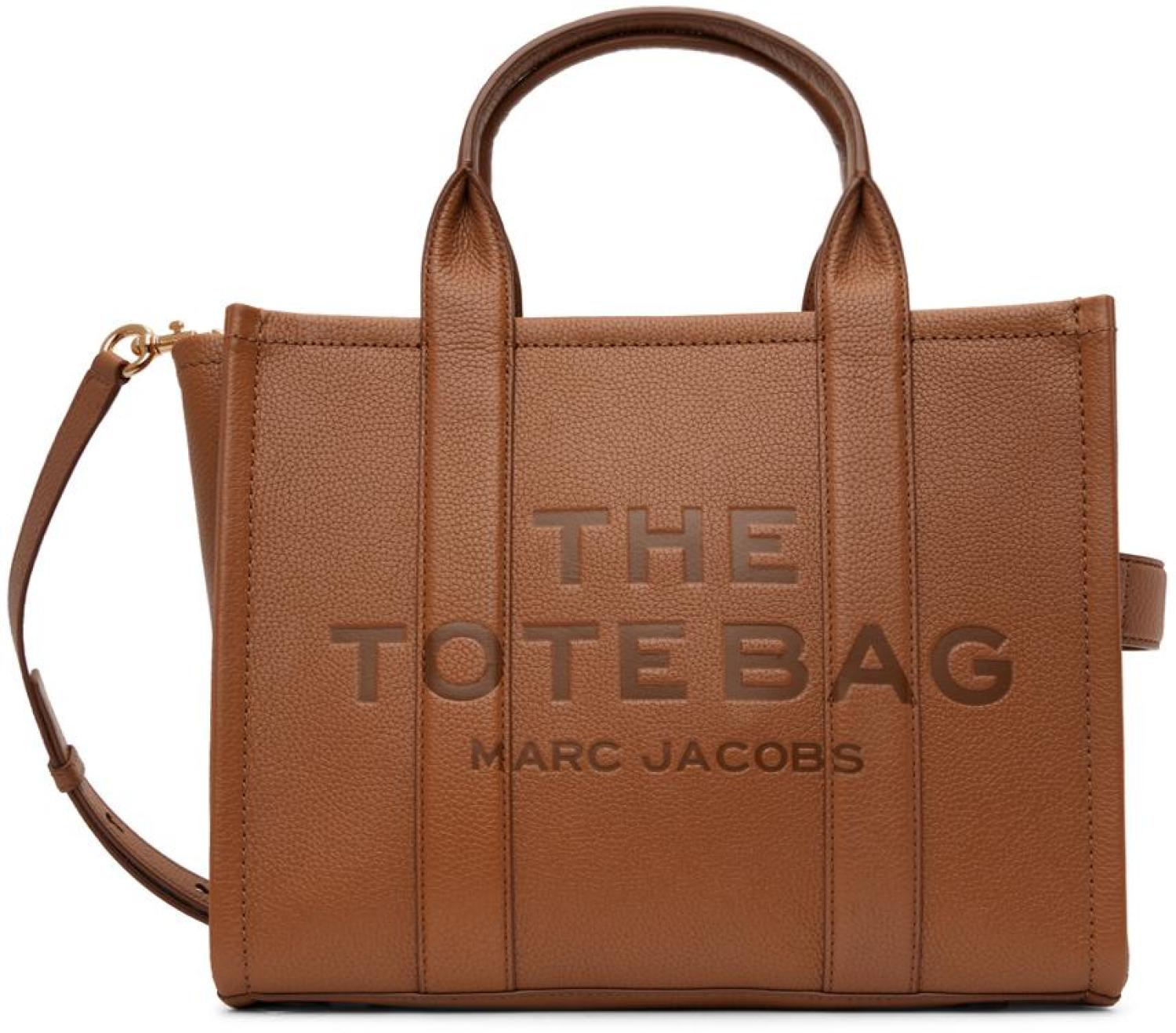 Marc Jacobs Brown 'The Leather Medium Tote Bag' Tote Grained leather tote in brown. · Detachable and adjustable shoulder strap · Twin rolled carry handles · Logo embossed at face · Embossed logo patch at back face · Zip closure · Zip pocket and patch pockets at interior · Unlined · H10.5 x W13 x D5 in Supplier color: Argan oil Leather. Made in Viet Nam. 231190F049014
