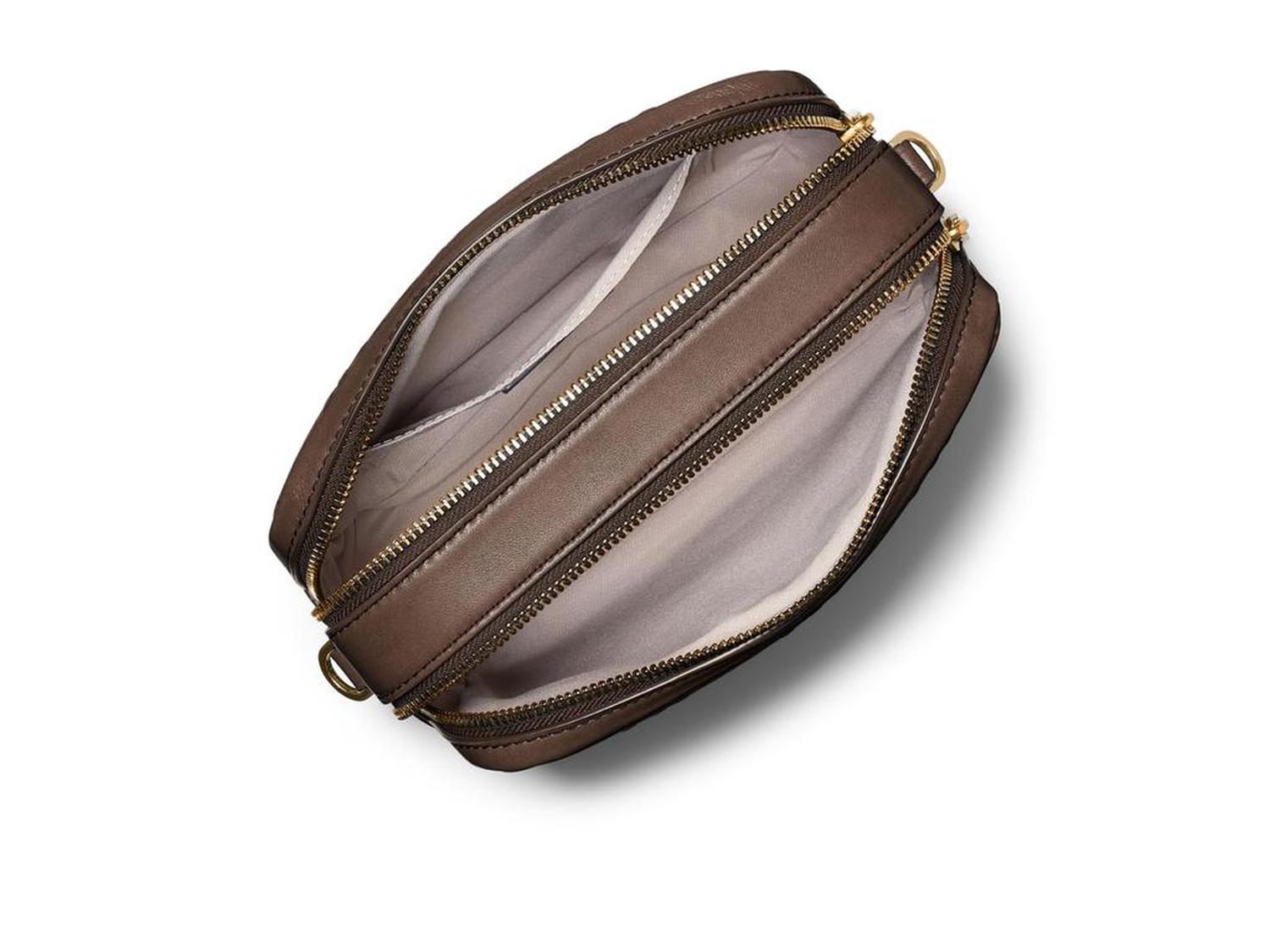 • Upgrade your accessory game choosing  the MICHAEL Michael Kors® Bryant Med Double Zip Chain Camera Xbody. Crafted from pebbled leather material, this stylish crossbody features a signature logo print that adds a touch of designer flair. With a double zippered top closure, you can keep your essentials secure. The removable and adjustable crossbody strap allows for customizable wear, while the goldtone detachable chain adds versatility to your look.