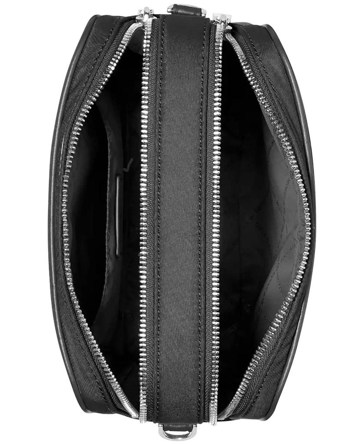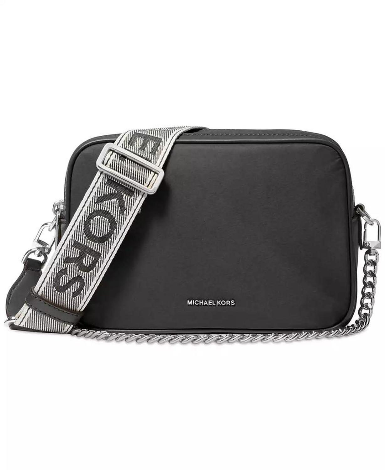 Accented with silver-tone hardware, this crossbody by MICHAEL Michael Kors features a double zip closure and a thick crossbody strap. Mini-sized bag; 7-1/2"W x 5"H x 3-1/4"D (width is measured across the bottom of handbag); 0.68 lbs. approx. weight Silhouette is based on 5'9" model 23" L strap Zip closure Silver-tone exterior hardware & back slip pocket; interior back slip pocket 100% nylon; lining: 100% polyester; trim: leather, 75% polyurethane, 25% polyester; trim 2: 99% polyester, 1% nylon Wipe clean Imported