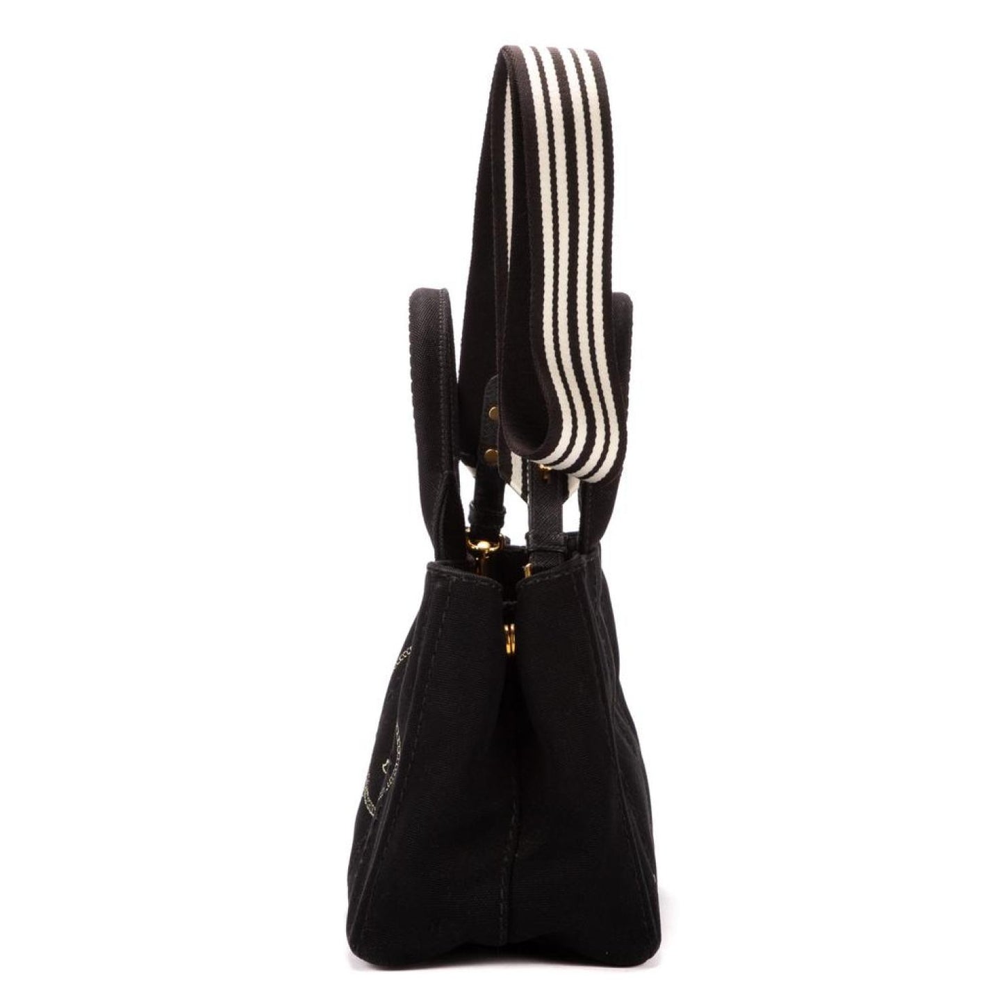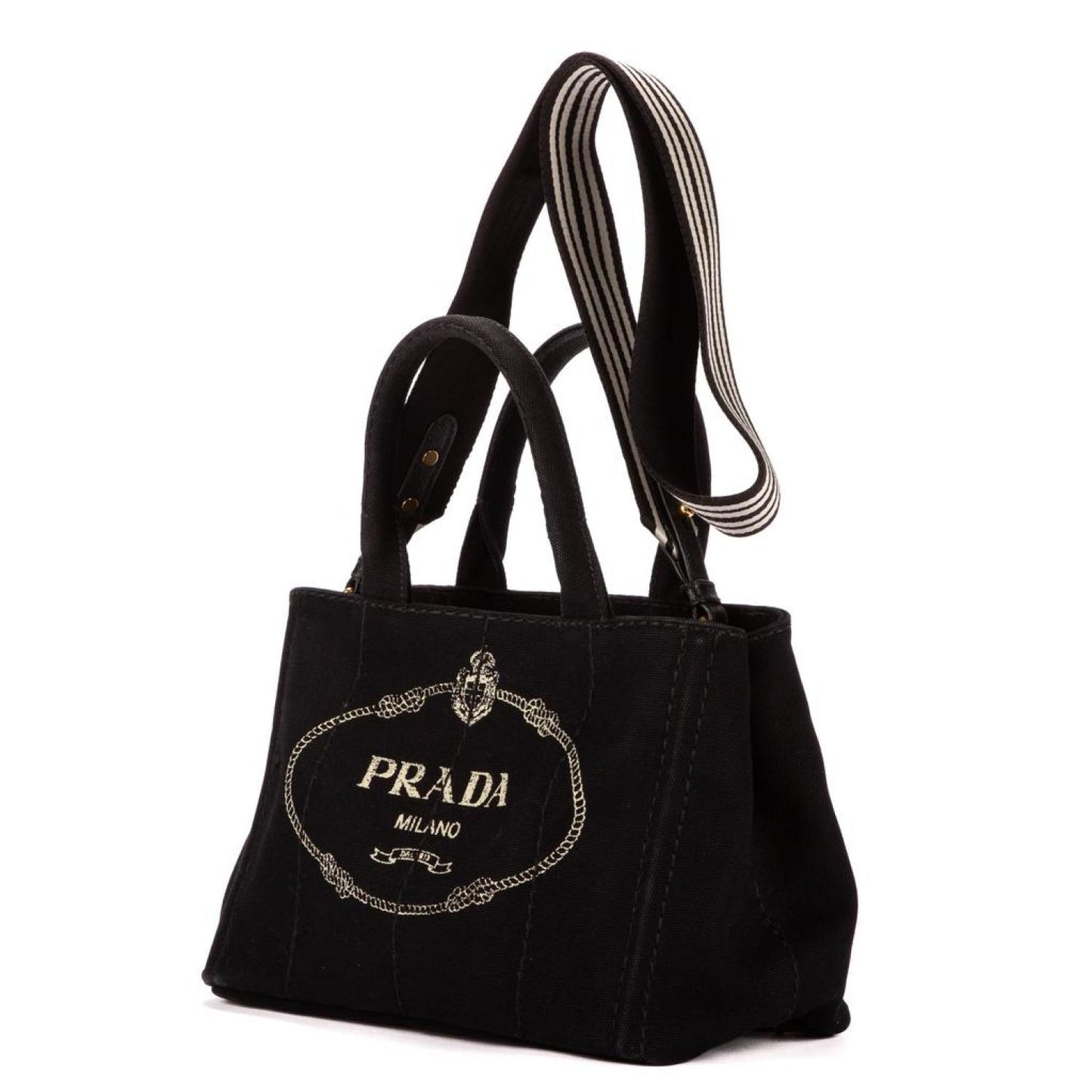 • Prada Handbag in Black "Canvas Fabric, Wite/Black removable adjustable nylon strap" and Gold hardware. Dimensions - 28*18*15cm. Serial number - None. Inclusions - Strap.