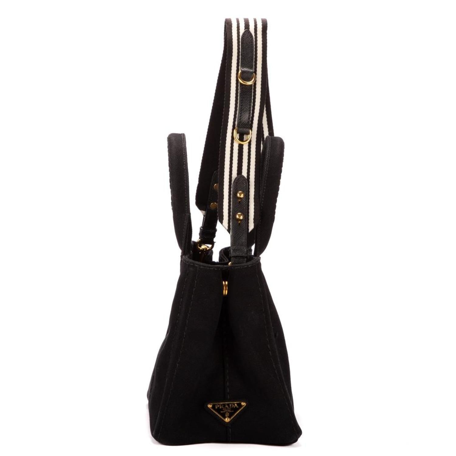 Prada Handbag in Black "Canvas Fabric, Wite/Black removable adjustable nylon strap" and Gold hardware. Dimensions - 28*18*15cm. Serial number - None. Inclusions - Strap.