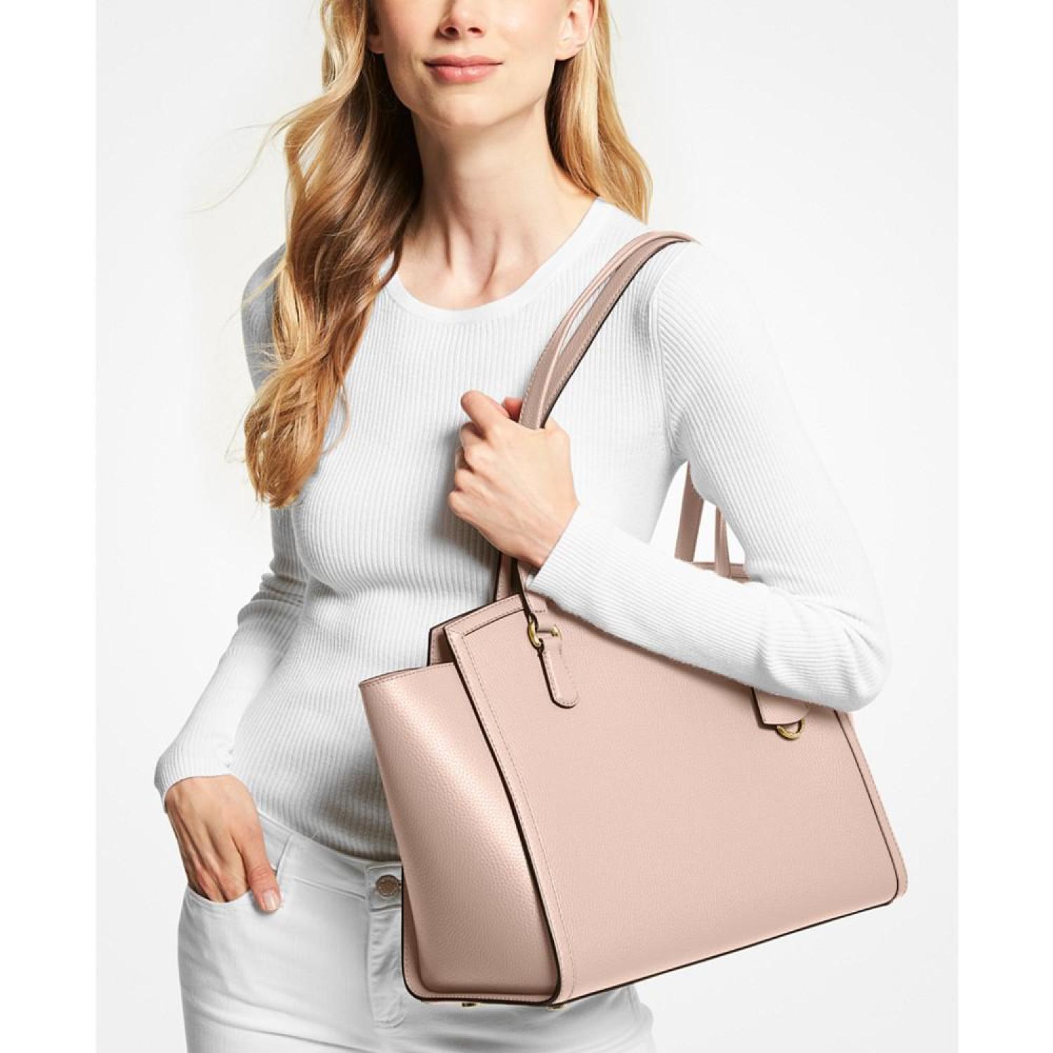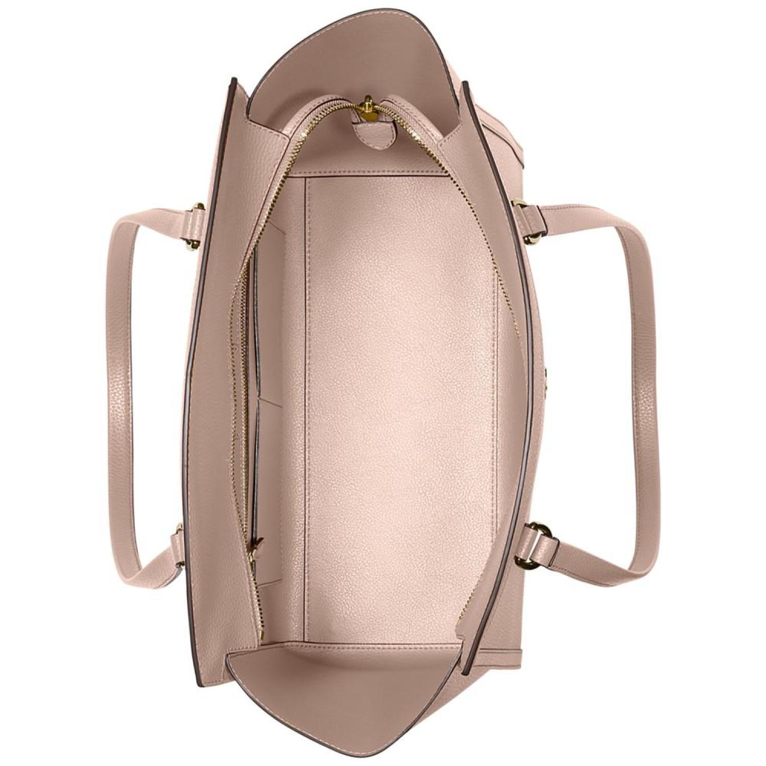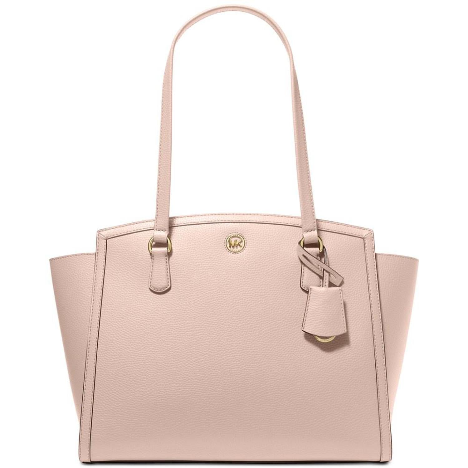 The Chantal handbag is a chic and structured carryall for every day. Large sized bag; 18"W x 10.5"H x 7"D (width is measured across the bottom of handbag); 2lbs. approx. weight Silhouette is based off 5'9" model Handle drop: 9.5" Top zip closure Gold-tone exterior hardware & logo 100% Leather Interior details: back zip pocket, 2 back slip pockets 100% Leather Lining: 100% Polyester Imported