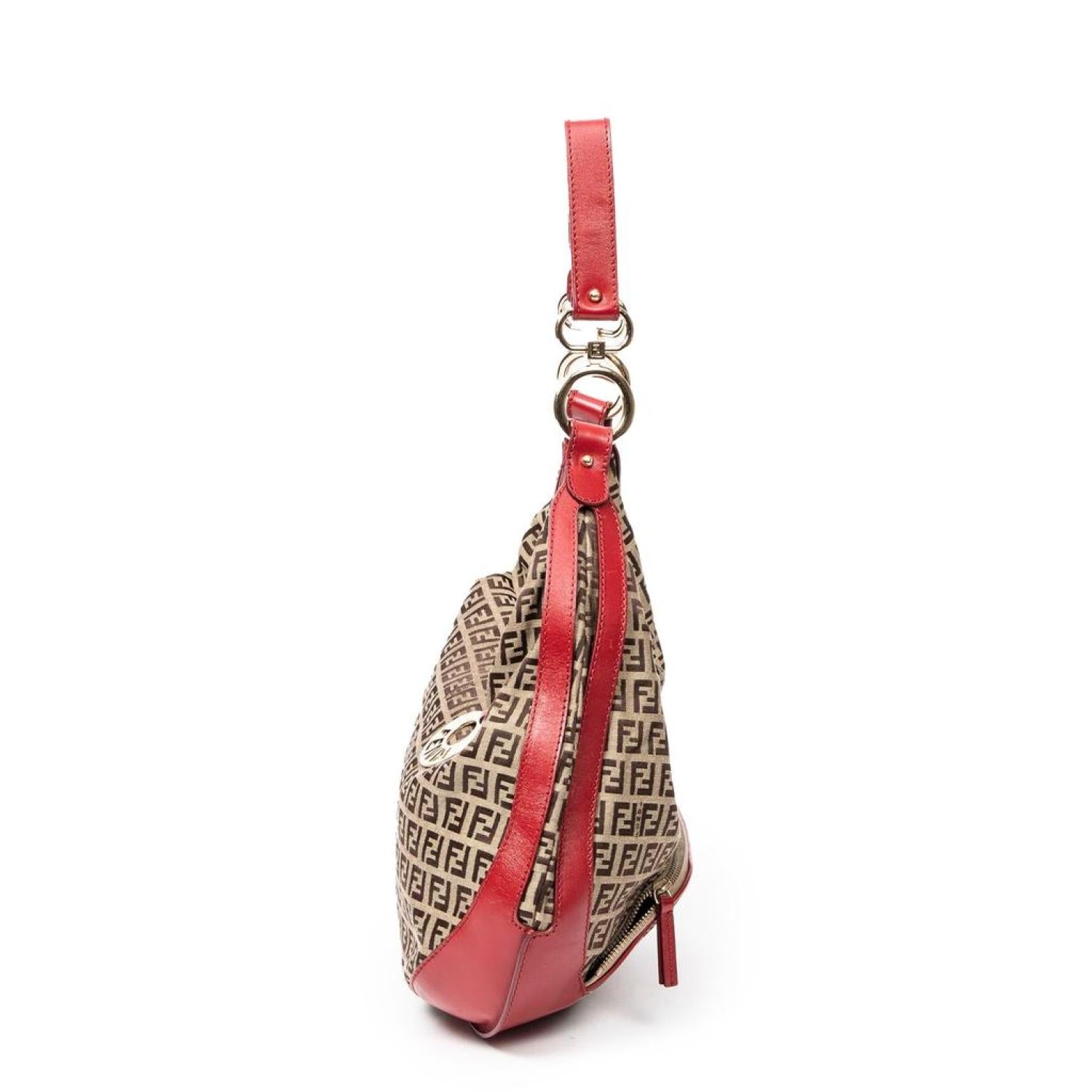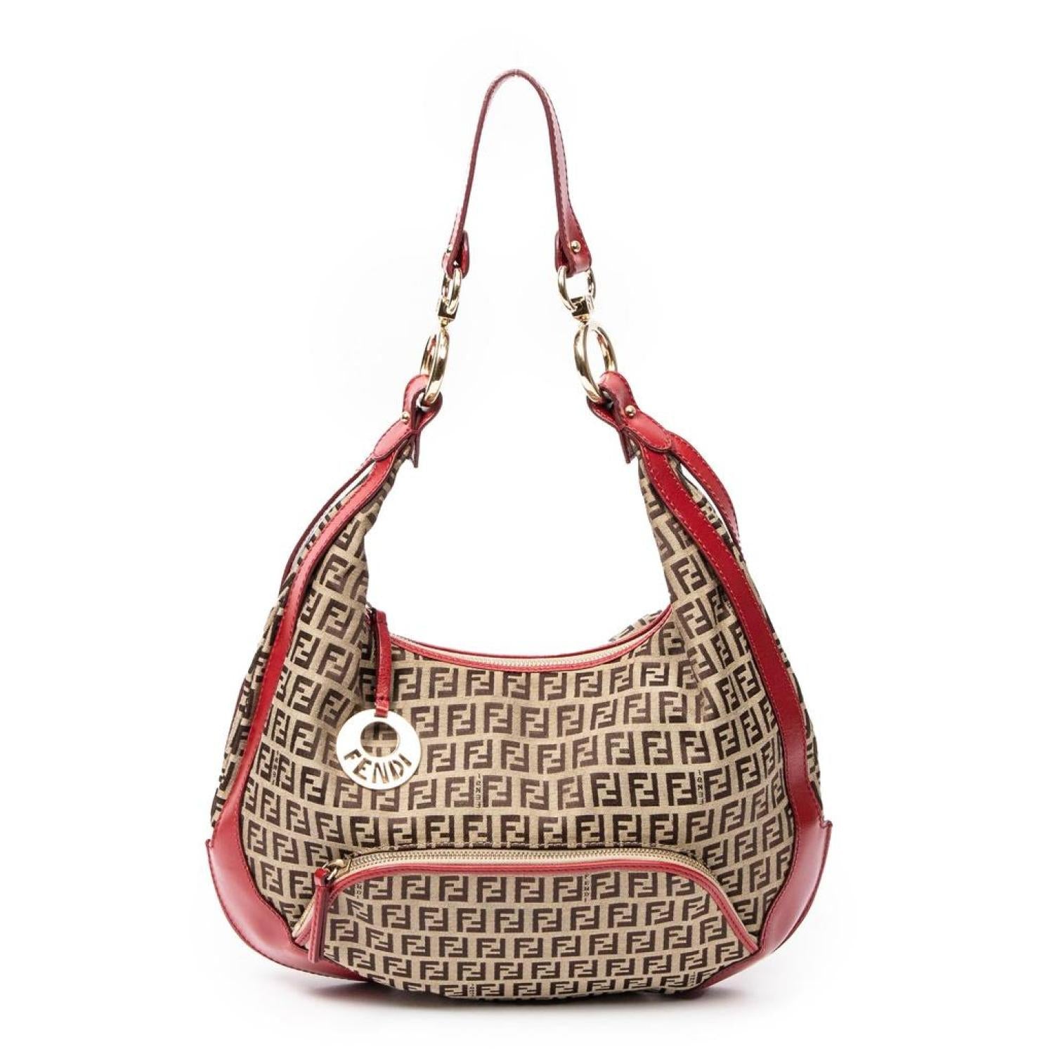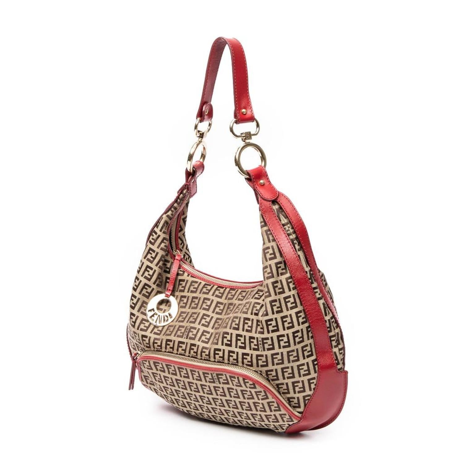 Fendi Shoulder Bag in Beige/Red Zucchino Canvas and Gold hardware. Dimensions - 39*26*2cm. Serial number - 2370-8BR465-LXT-049. Inclusions - charm.