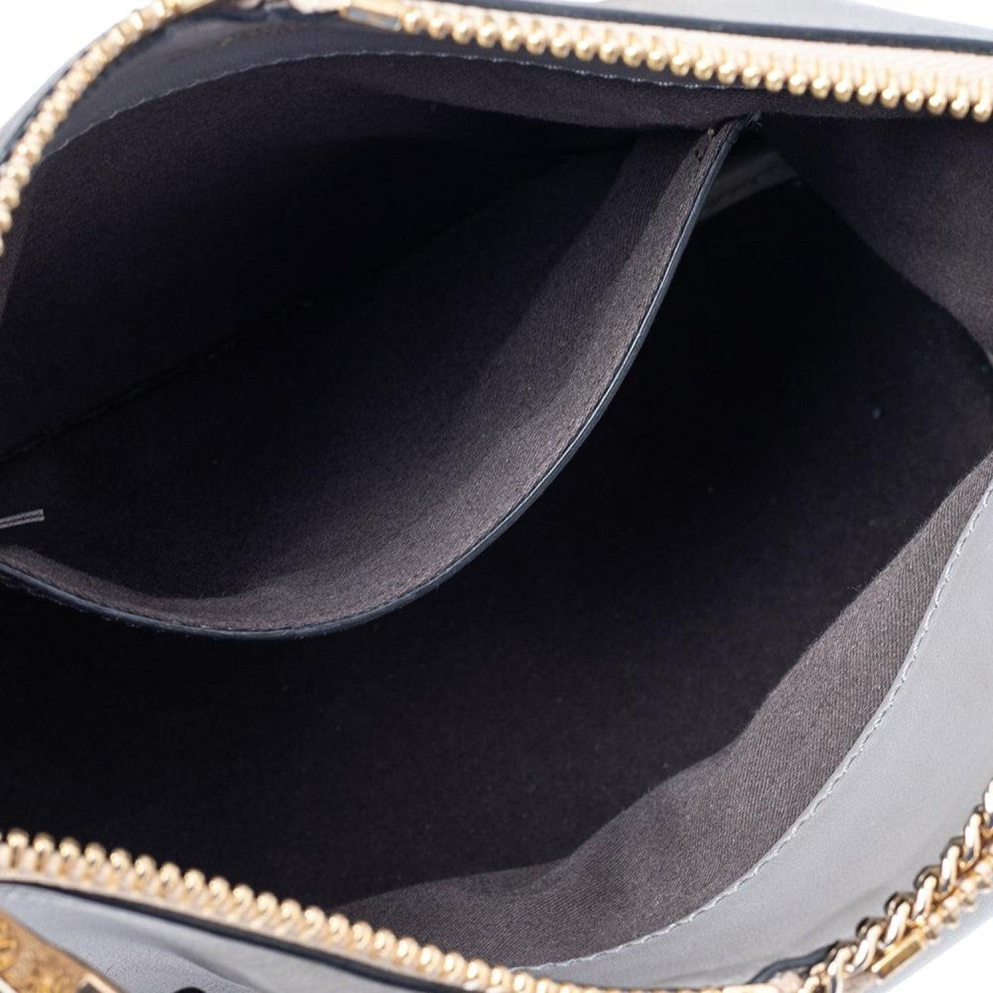 The Baylee bag is one of the many Chloe popular bags. It has a minimal design but with very interesting details. The smooth grey beige leather exterior is paired with rolled handles a gold tone chain and a removable shoulder strap. The fabric lined interior is quite spacious and can hold all your day to night essentials.
