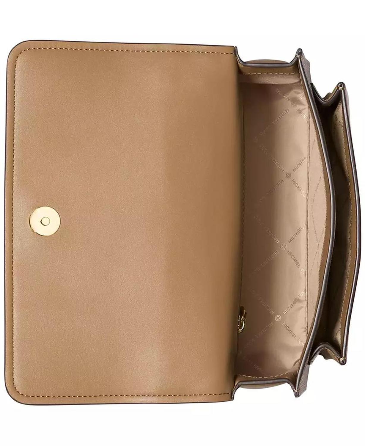 This sophisticated everyday shoulder bag by MICHAEL Michael Kors is accented with an allover logo monogram and chain shoulder strap. Small sized bag; 9-1/4"W x 5-1/2"H x 3"D (width is measured across the bottom of handbag); 1.06 lbs. approx. weight Silhouette is based off 5'9" model Removable chain shoulder strap Flap with magnetic closure Gold-tone exterior hardware & back slip pocket; interior zip pocket & slip pocket 89% PVC, 10% polyester, 1% polyurethane; lining: 100% polyester; trim: 75% polyurethane, 25% polyester Wipe clean Imported