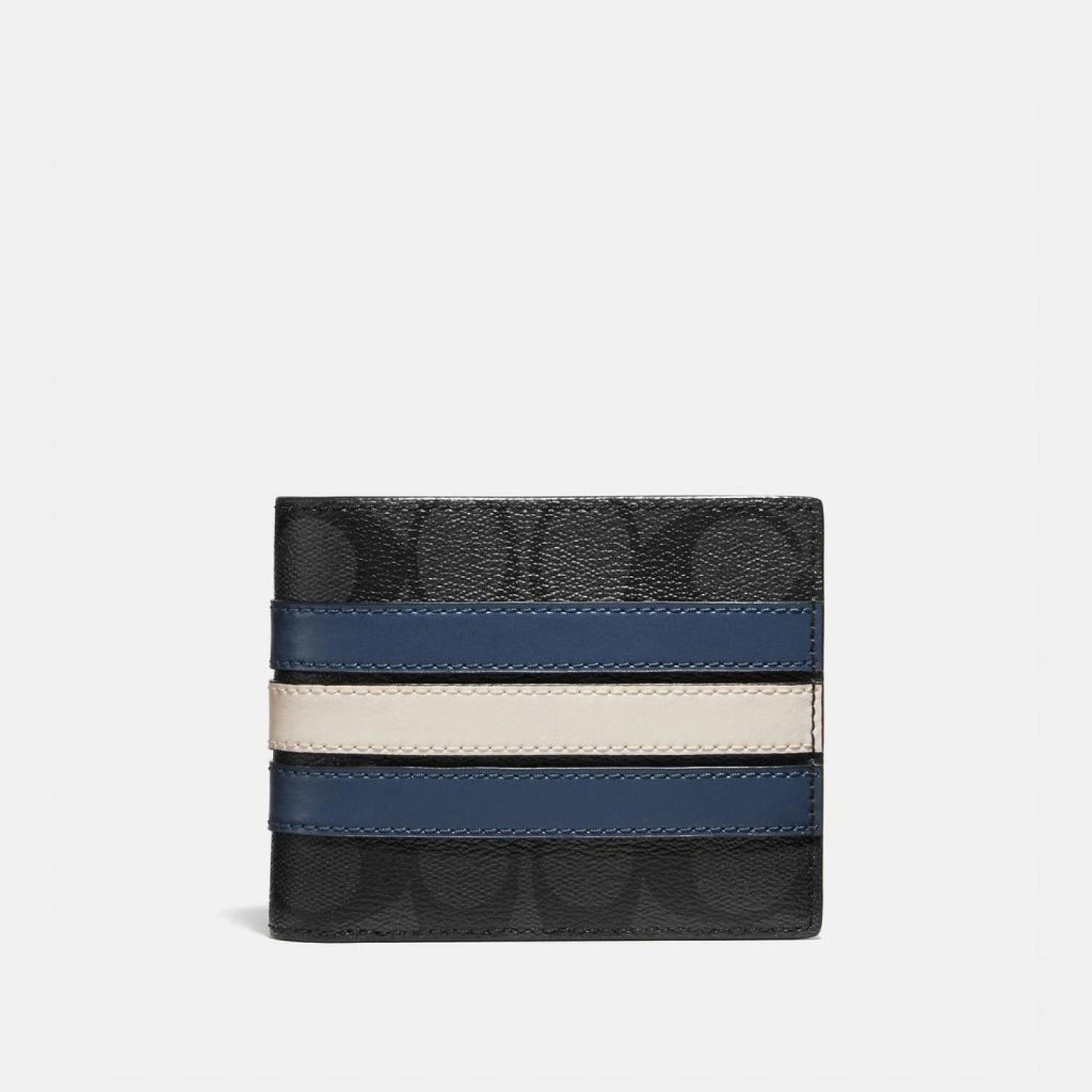 Signature coated canvas and smooth calf leather Eight credit card slots Full-length bill compartments Removable insert with ID window and two credit card slots 4 1/4 (L) x 3 3/4 (H) x 3/4 (W) Style No. 3008 | Coach Outlet 3 In 1 Wallet In Signature Canvas With Varsity Stripe - Black