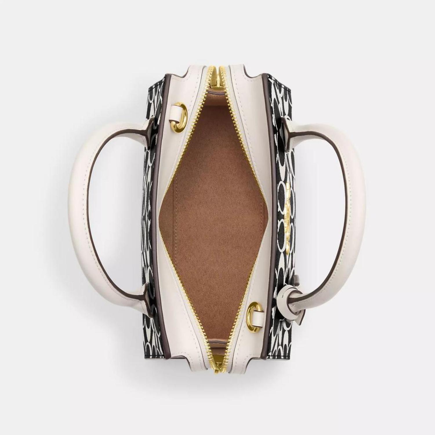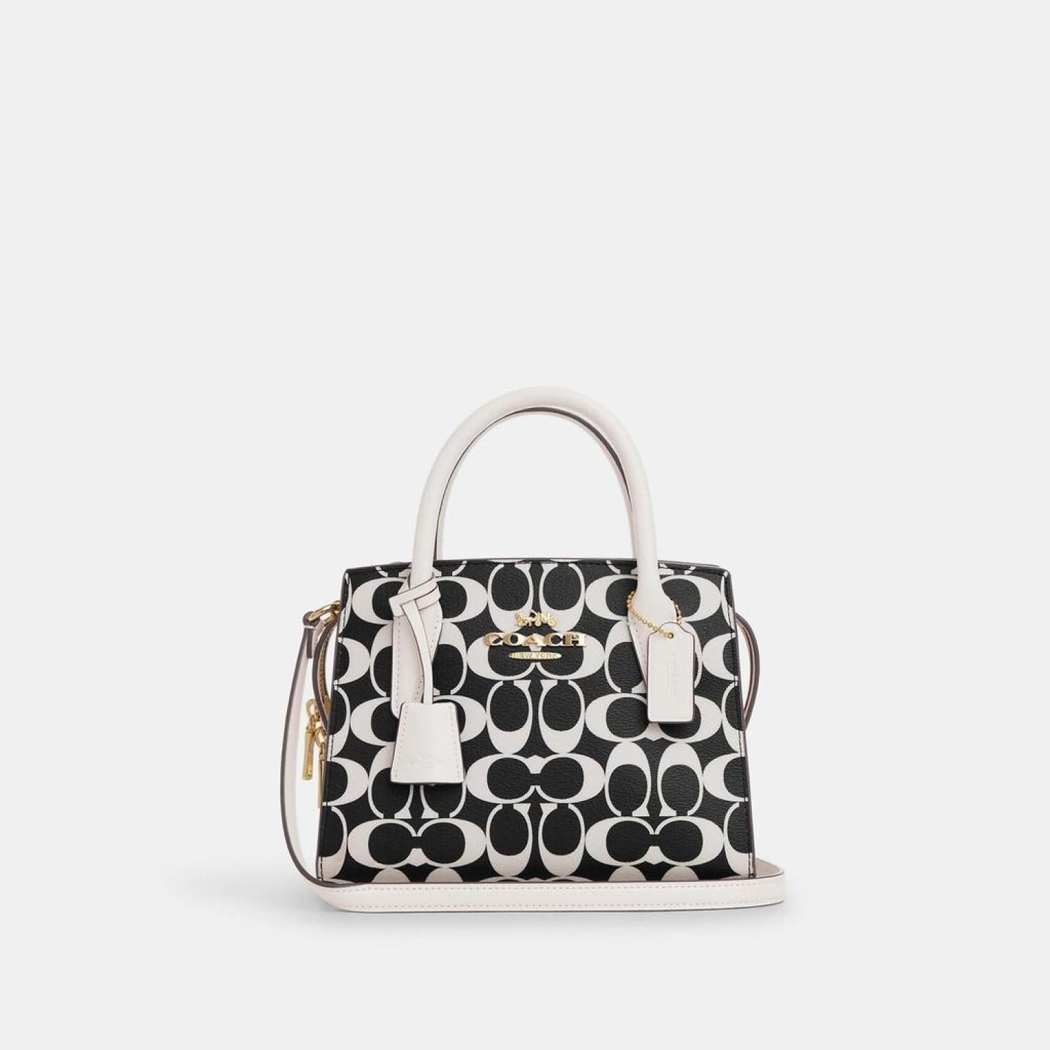 Signature coated canvas and smooth leather Inside multifunction pocket Zip closure fabric lining Handles with 3 1/4 drop Detachable strap with 21 3/4 drop for shoulder or crossbody wear Four protective feet at base 8 3/4 (L) x 6 1/2 (H) x 4 1/2 (W) Style No. CP080 | Coach Outlet Andrea Carryall In Signature Canvas - Black