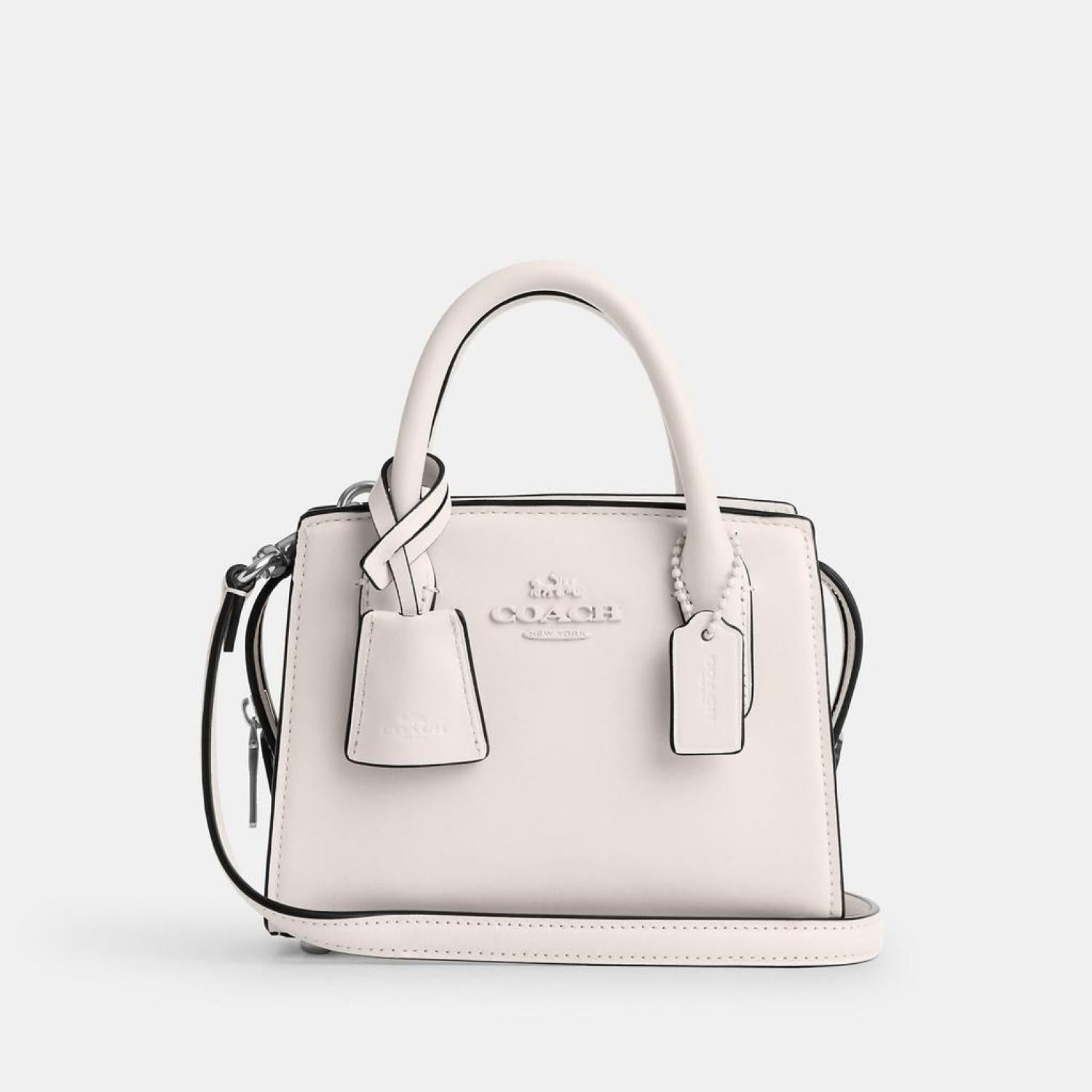 Refined calf leather Inside multifunction pocket Zip closure fabric lining Handles with 2 drop Detachable strap with 22 3/4 drop for shoulder or crossbody wear Four protective feet at base 6 (L) x 4 1/2 (H) x 3 1/4 (W) Style No. CO974 | Coach Outlet Andrea Mini Carryall - White