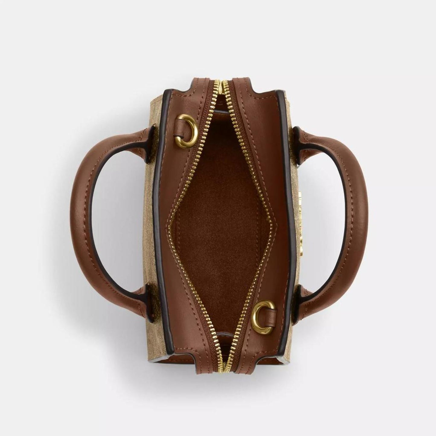 Signature coated canvas and smooth leather Inside multifunction pocket Zip closure fabric lining Handles with 2 drop Detachable strap with 22 3/4 drop for shoulder or crossbody wear Four protective feet at base 6 (L) x 4 1/2 (H) x 3 1/4 (W) Style No. CO975 | Coach Outlet Andrea Mini Carryall In Signature Canvas - Beige