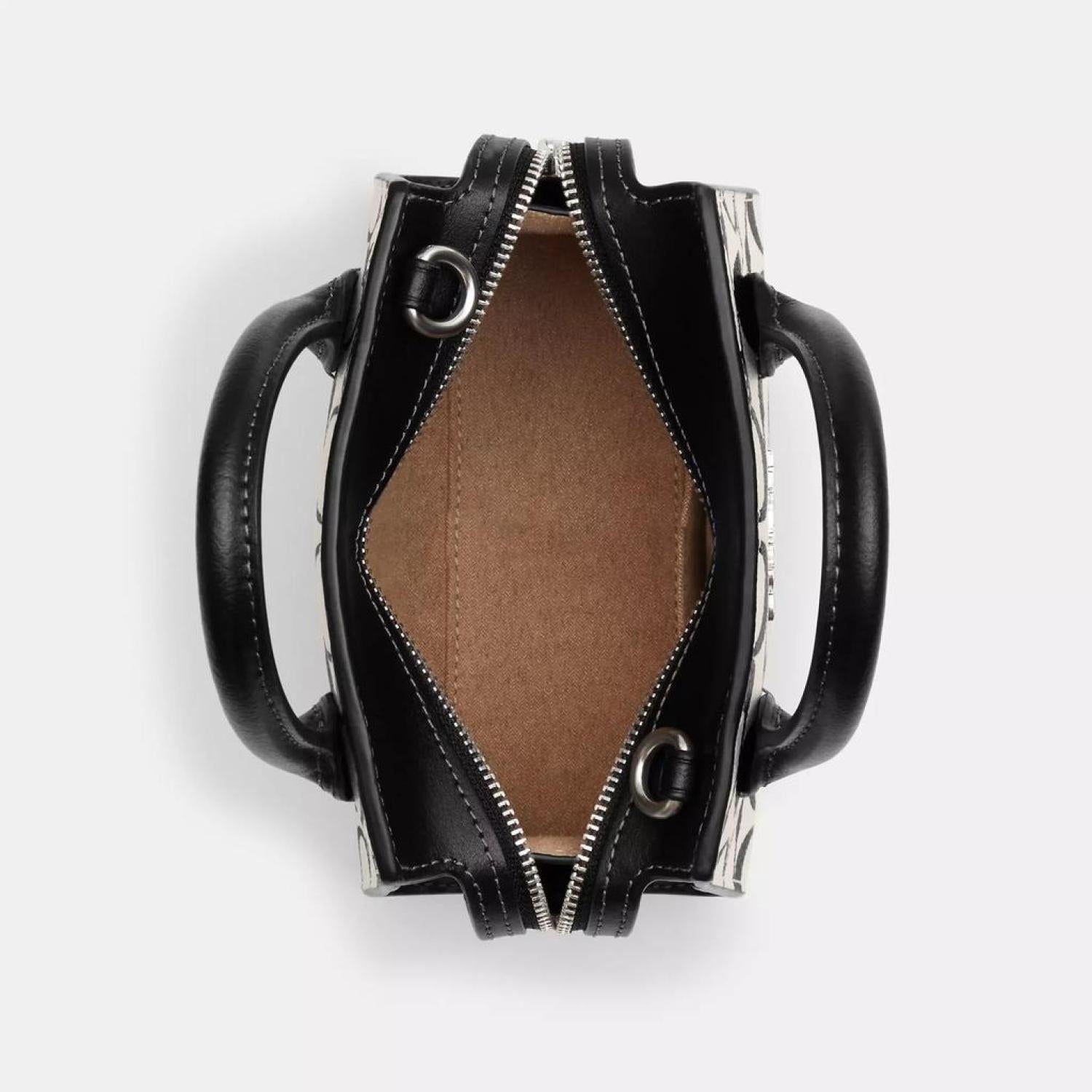 Signature coated canvas and smooth leather Inside multifunction pocket Zip closure fabric lining Handles with 2 drop Detachable strap with 22 3/4 drop for shoulder or crossbody wear Four protective feet at base 6 (L) x 4 1/2 (H) x 3 1/4 (W) Style No. CO973 | Coach Outlet Andrea Mini Carryall In Signature Canvas - White
