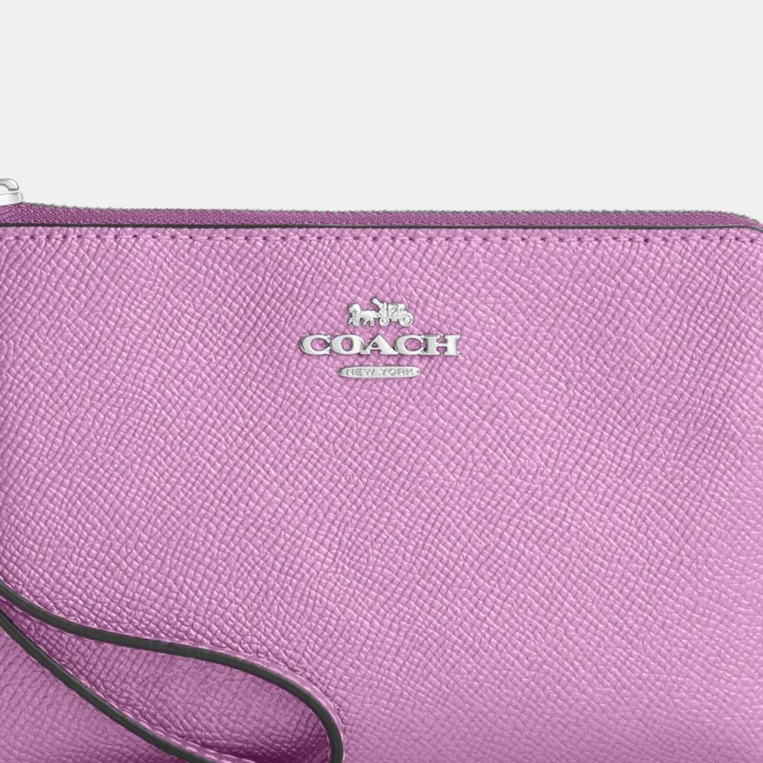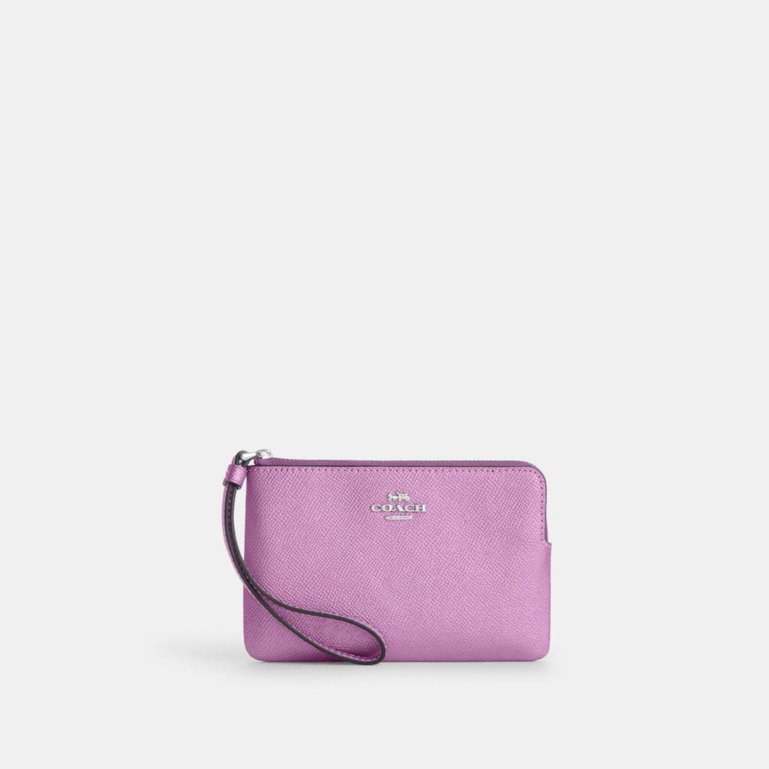 • Metallic crossgrain leather Two credit card slots Zip-top closure fabric lining Wrist strap attached 6 1/4 (L) x 4 (H) x 1/2 (W) Style No. CP439 | Coach Outlet Corner Zip Wristlet - Purple