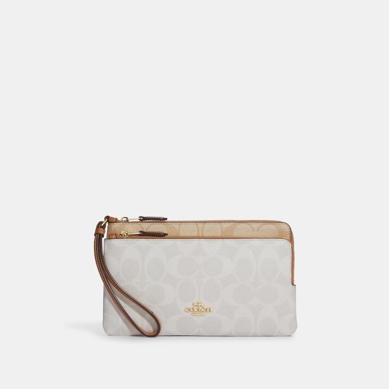 Signature coated canvas and smooth leather Eight credit card slots Inside open pockets Double zip closure fabric lining Wrist strap attached 8 (L) x 4 3/4 (H) x 1 (W) Fits all phone sizes up to an iPhone X and Samsung S7 Edge Style No. C7313 | Coach Outlet Double Zip Wallet In Blocked Signature Canvas - Beige