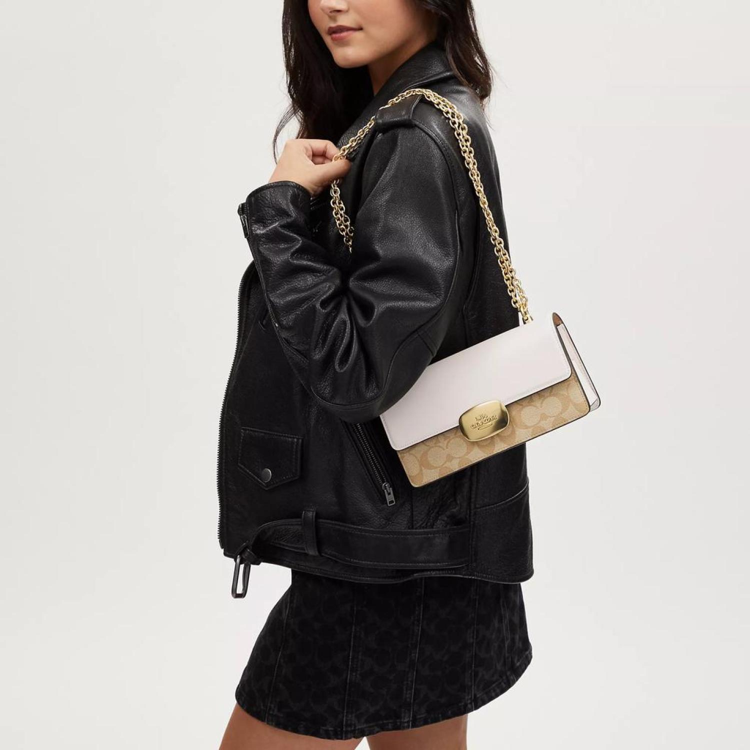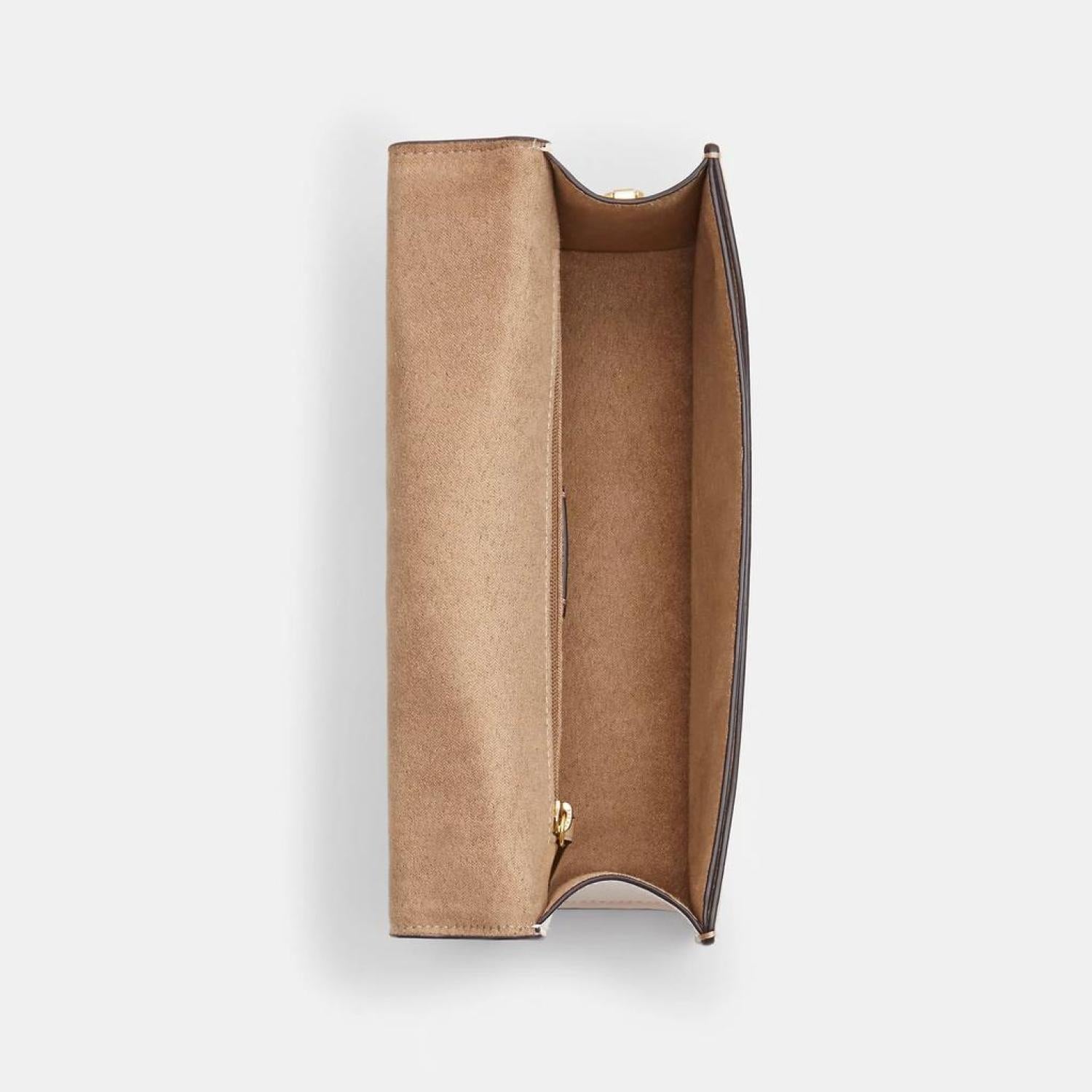 • Signature coated canvas and smooth leather Inside zip and multifunction pockets Snap closure fabric lining Outside open pocket Chain strap with 22 1/2 drop for shoulder or crossbody wear 9 (L) x 4 3/4 (H) x 2 1/4 (W) Style No. CP009 | Coach Outlet Eliza Flap Crossbody In Signature Canvas - Beige