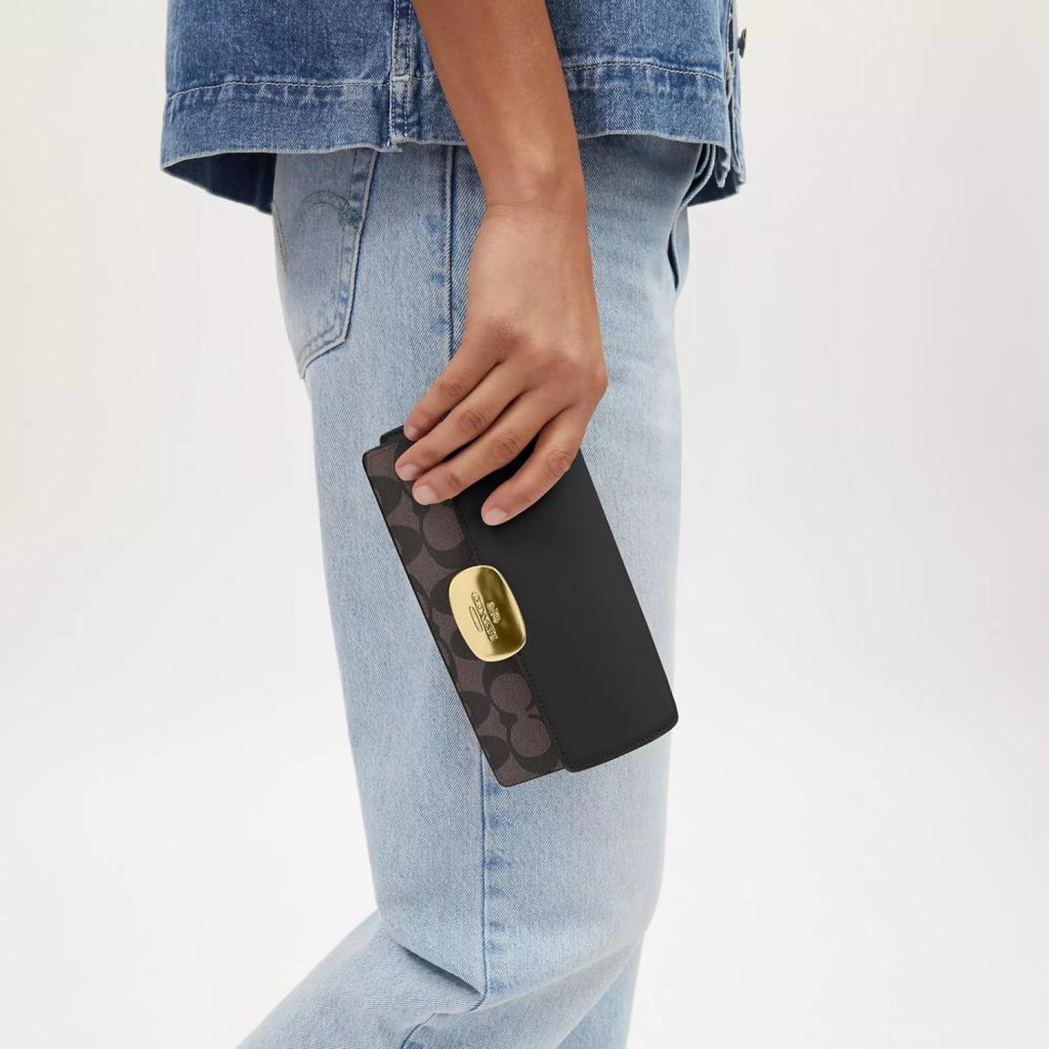 Signature coated canvas and smooth leather Inside multifunction pocket Snap closure fabric lining Outside open pocket Detachable strap with 23 drop for shoulder or crossbody wear 7 1/2 (L) x 4 (H) x 1 1/2 (W) Style No. CP044 | Coach Outlet Eliza Small Flap Crossbody In Signature Canvas - Brown