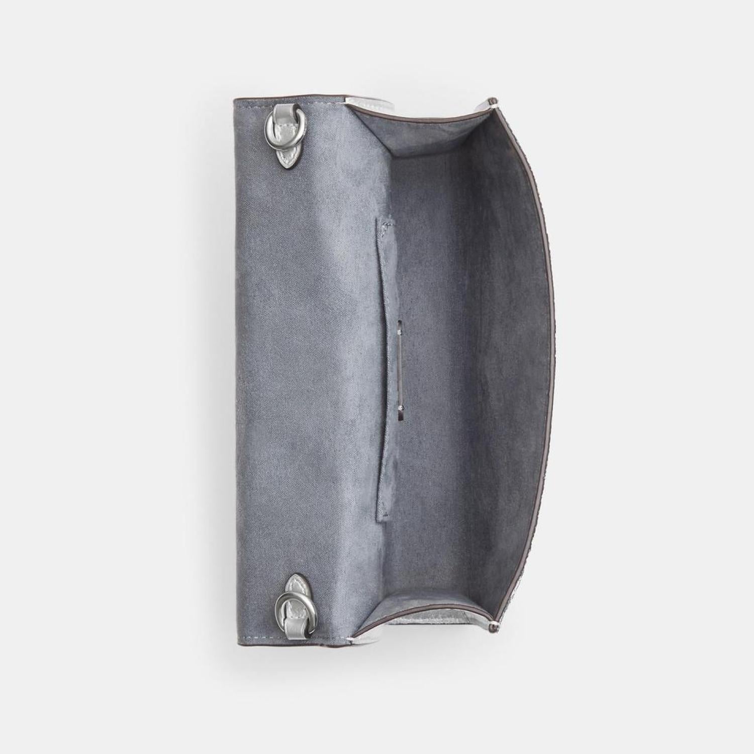 Glitter foil metallic smooth leather and metallic refined calf leather Inside multifunction pocket Snap closure fabric lining Outside open pocket Detachable strap with 21 3/4 drop for shoulder or crossbody wear 8 1/2 (L) x 5 1/4 (H) x 2 (W) Style No. CP189 | Coach Outlet Flap Crossbody - Grey
