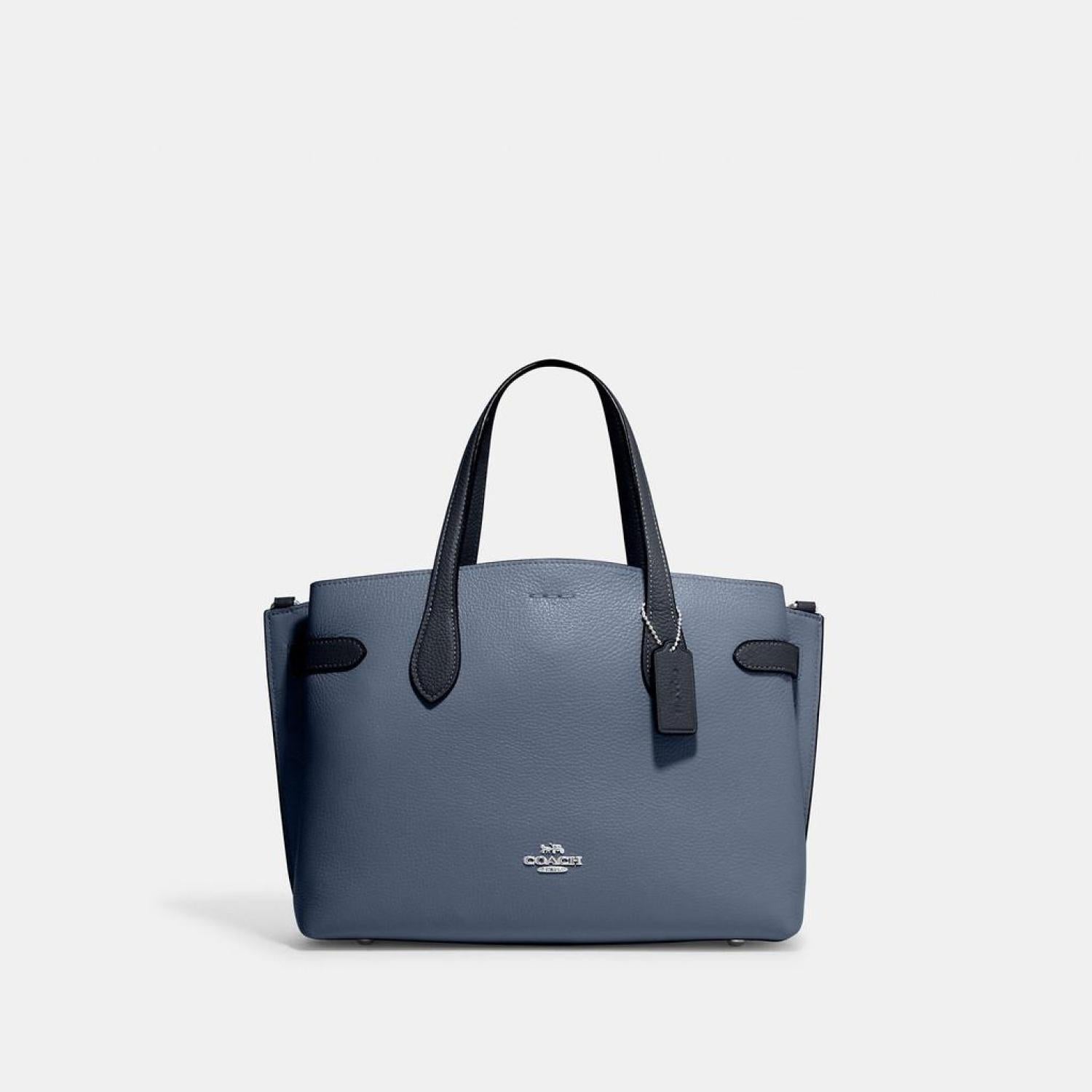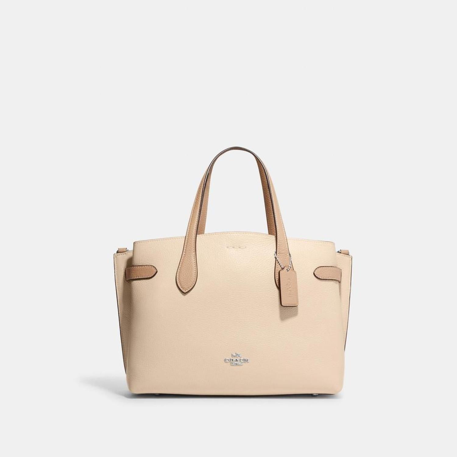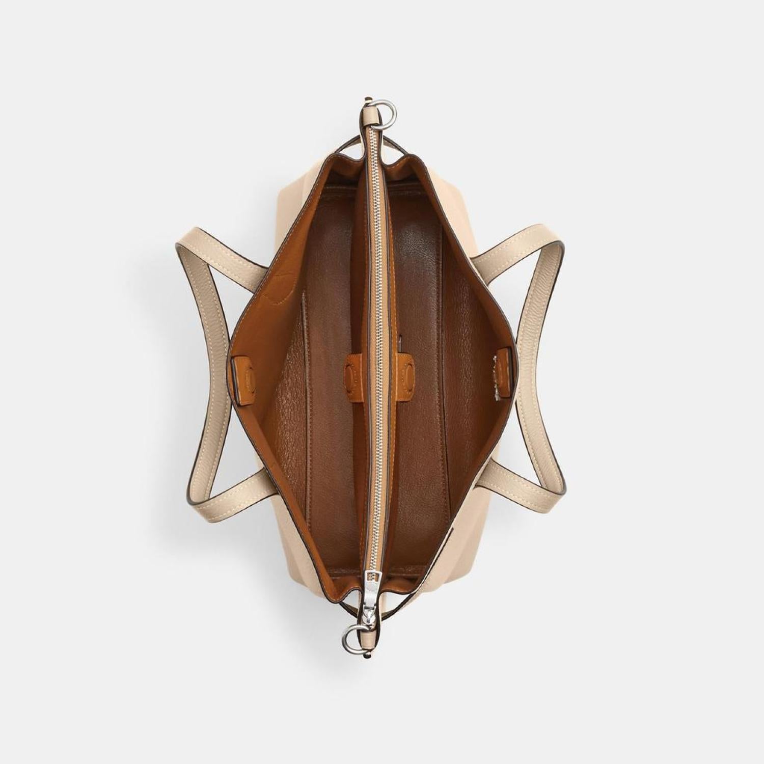 Refined pebble leather Inside multifunction pocket Center zip compartment Magnetic snap closure fabric lining Handles with 5 3/4 drop Detachable strap with 20 1/2 drop for shoulder or crossbody wear Four protective feet at base 11 3/4 (L) x 9 (H) x 5 1/2 (W) Style No. CH536 | Coach Outlet Hanna Carryall - White