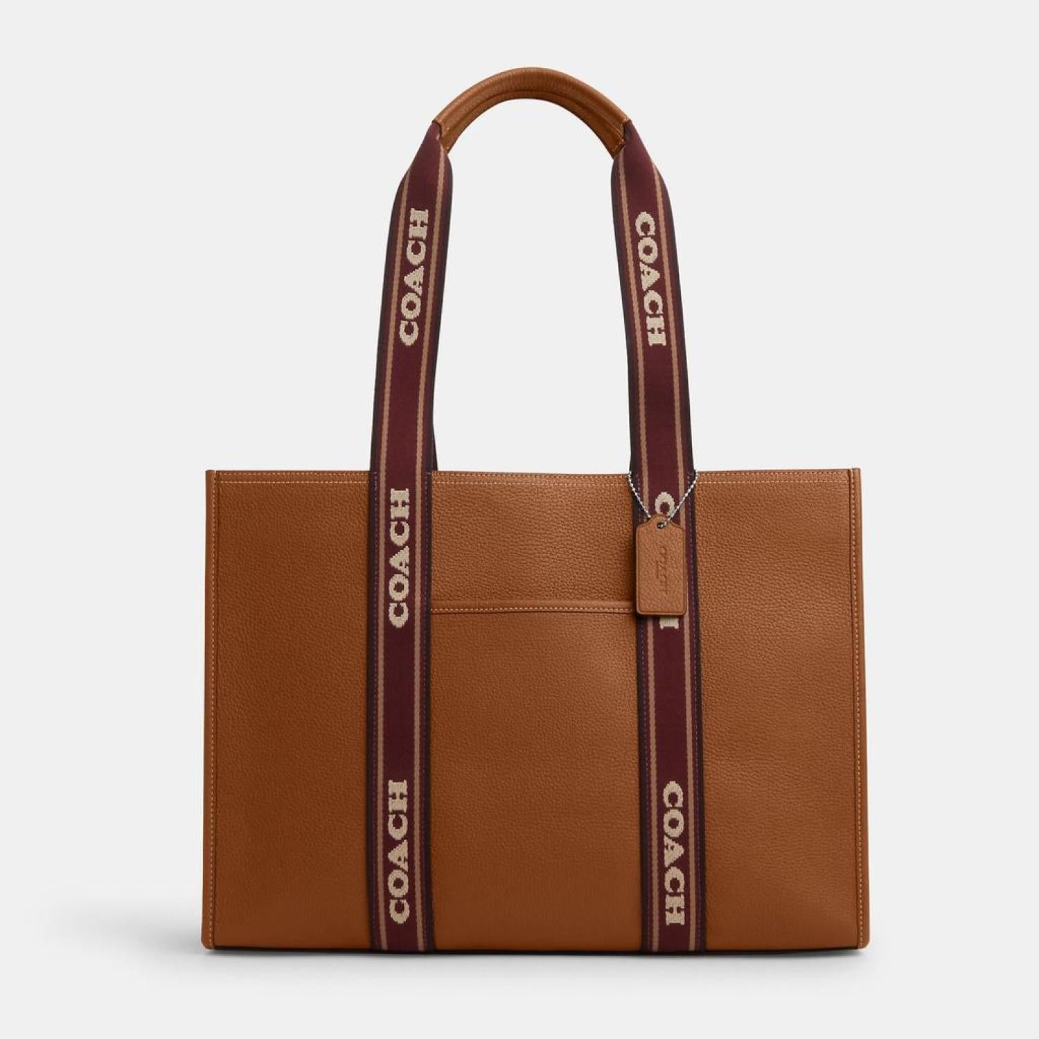 • Refined pebble leather Inside zip and multifunction pockets Snap closure fabric lining Handles with 10 1/2 drop Outside open pocket 16 1/2 (L) x 12 (H) x 6 (W) Style No. CM716 | Coach Outlet Large Smith Tote - Brown