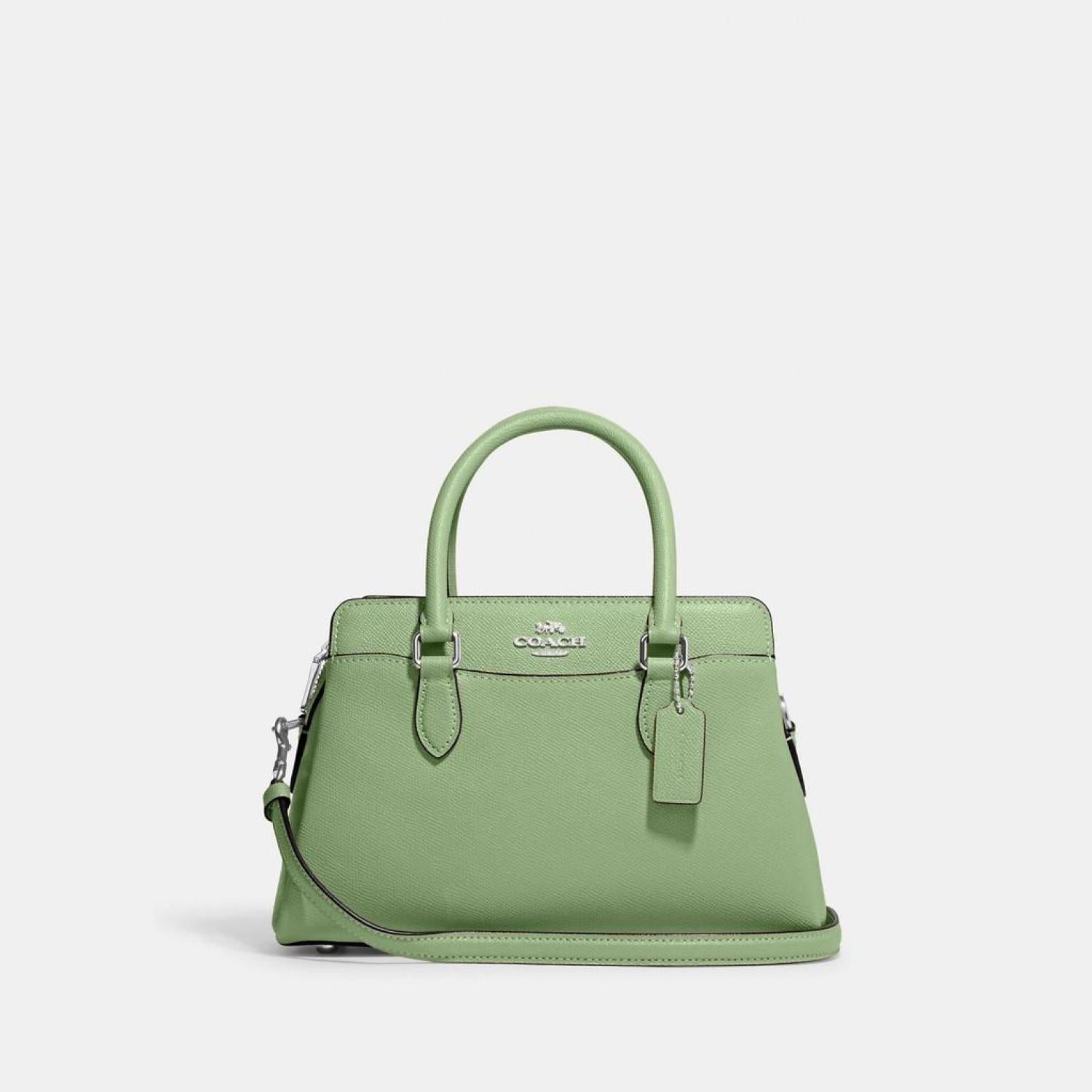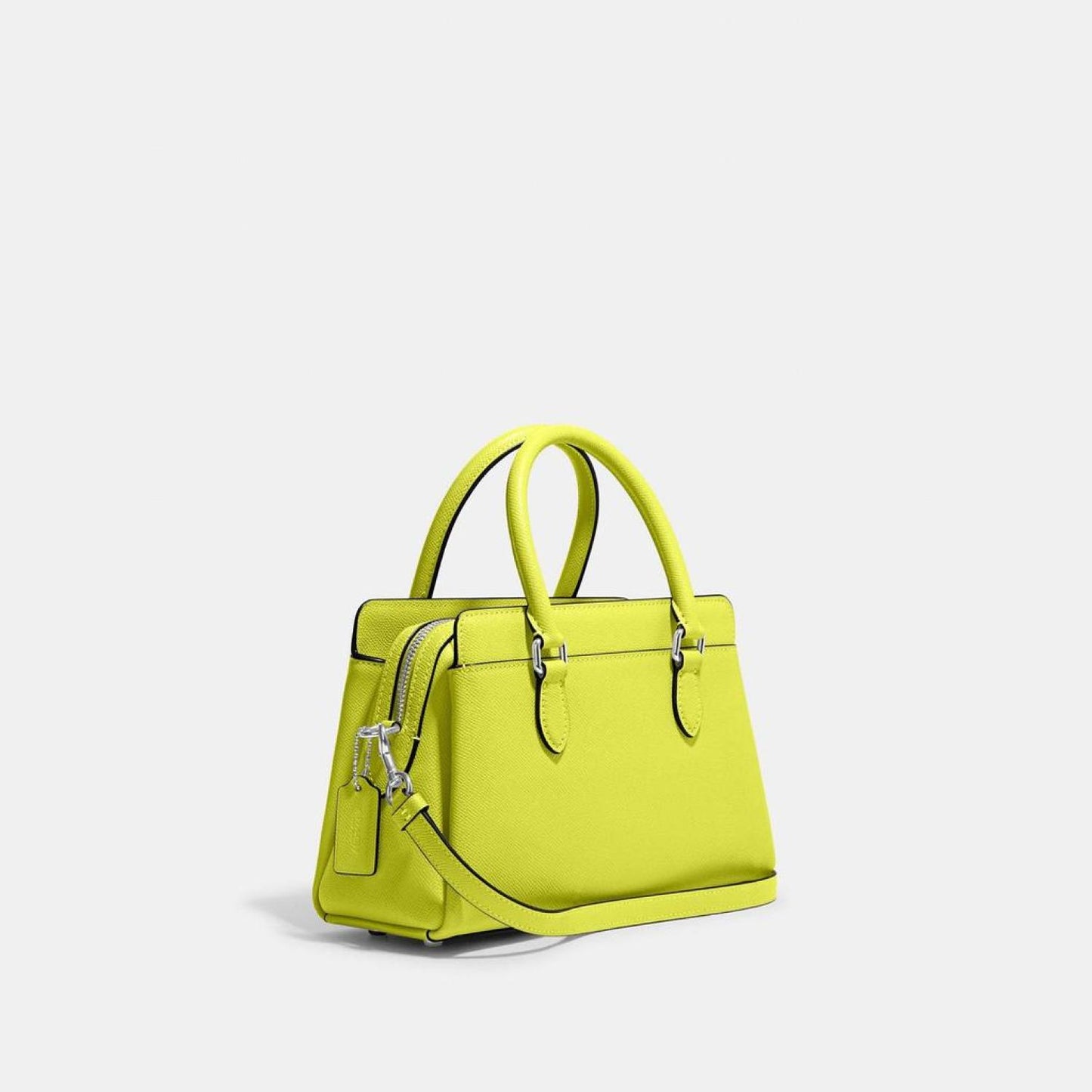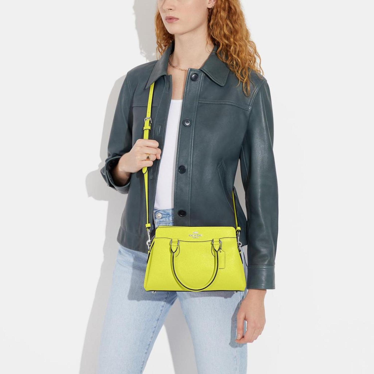 Crossgrain leather Inside multifunction pocket Zip closure fabric lining Side slip compartments Handles with 4 drop Outside open pockets Detachable strap with 21 1/2 drop for shoulder or crossbody wear Four protective feet at base 10 1/4 (L) x 6 3/4 (H) x 4 1/4 (W) Style No. CH297 | Coach Outlet Mini Darcie Carryall - Yellow