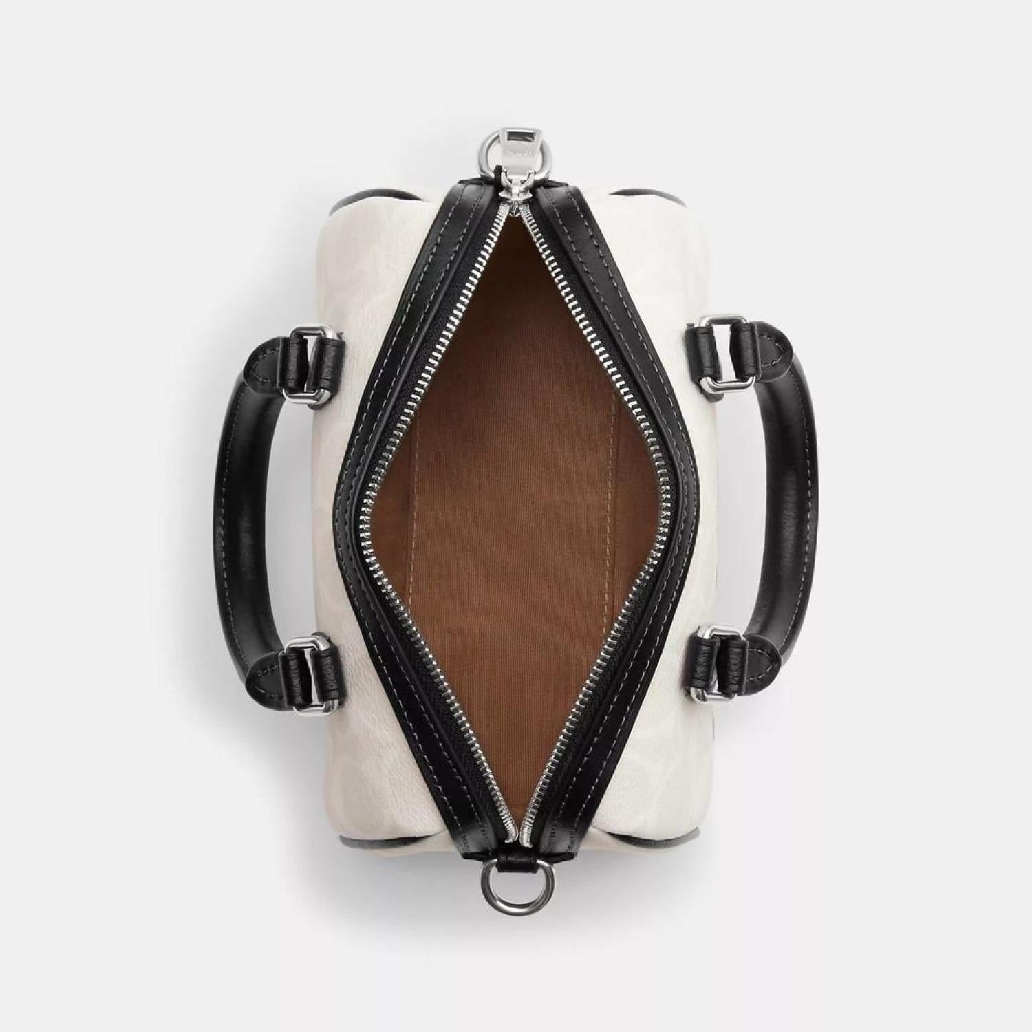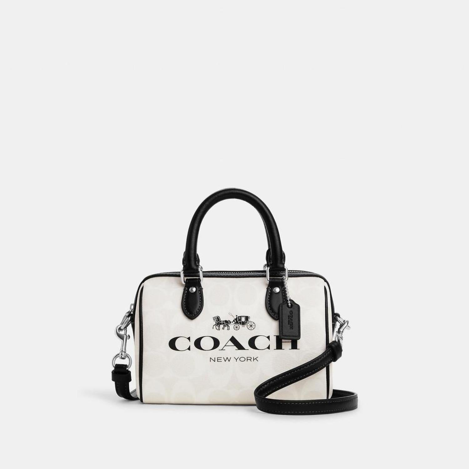 Signature coated canvas and smooth leather Two credit card slots Zip-top closure fabric lining Handles with 2 3/4 drop Detachable strap with 23 1/2 drop for shoulder or crossbody wear 7 (L) x 4 3/4 (H) x 4 (W) Style No. CO959 | Coach Outlet Mini Rowan Crossbody In Signature Canvas - White