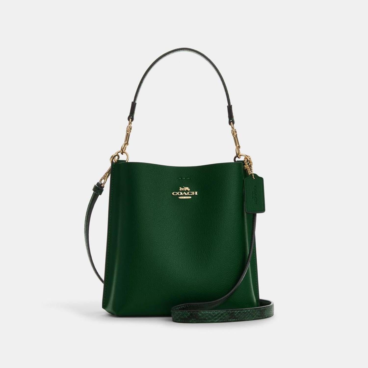 • Double face leather and snake-embossed leather Center zip compartment Snap closure Detachable handle with 6 3/4 drop Detachable strap with 22 drop for shoulder or crossbody wear 8 (L) x 8 1/2 (H) x 4 (W) Style No. CB901 | Coach Outlet Mollie Bucket Bag 22 - Red