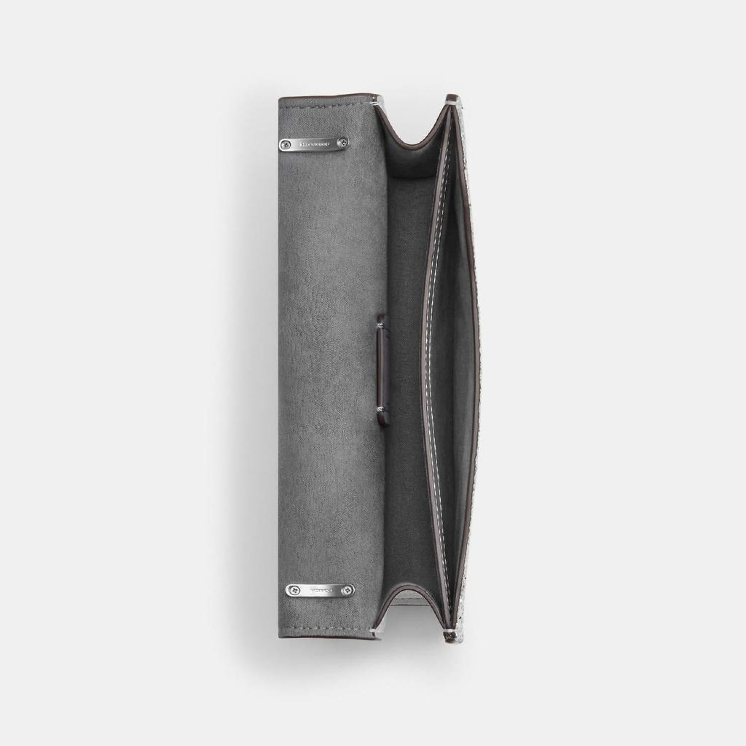 Glitter foil metallic smooth leather and metallic refined calf leather Inside multifunction pocket Snap closure fabric lining Outside open pocket Detachable strap with 23 3/4 drop for shoulder or crossbody wear 7 3/4 (L) x 4 1/4 (H) x 1 3/4 (W) Style No. CO981 | Coach Outlet Morgan Crossbody - Grey