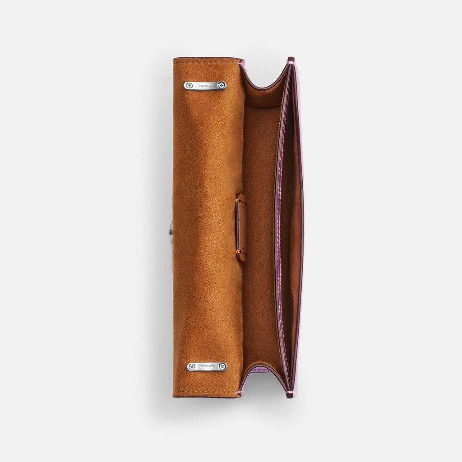Foil metallic smooth leather and metallic refined calf leather Inside multifunction pocket Snap closure fabric lining Outside open pocket Detachable strap with 23 3/4 drop for shoulder or crossbody wear 7 3/4 (L) x 4 1/4 (H) x 1 3/4 (W) Style No. CO984 | Coach Outlet Morgan Crossbody - Purple